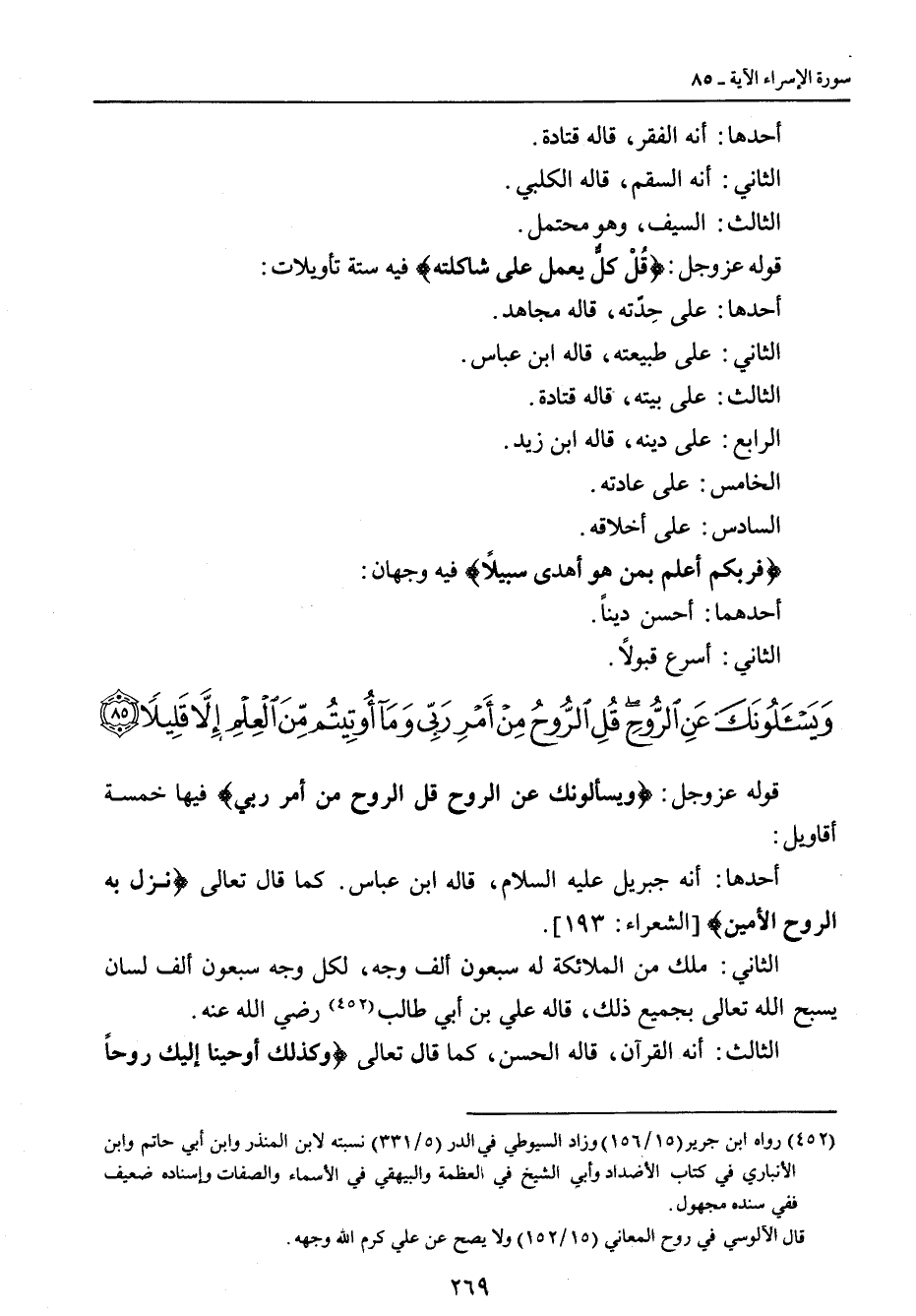 أحدها: أنه الفقر , قاله قتادة. الثاني: أنه السقم , قاله الكلبي. الثالث: السيف , وهو محتمل. قوله عز وجل: {قُلْ كلٌّ يعمل على شاكلته} في ستة تأويلات: أحدها: على حِدّته , قاله مجاهد. الثاني: على طبيعته , قاله ابن عباس. الثالث: على بيته , قاله قتادة. الرابع: على دينه , قاله ابن زيد. الخامس: على عادته. السادس: على أخلاقه. {فربكم أعلم بمن هو أهدى سبيلاً} فيه وجهان: أحدهما: أحسن ديناً. الثاني: أسرع قبولاً.