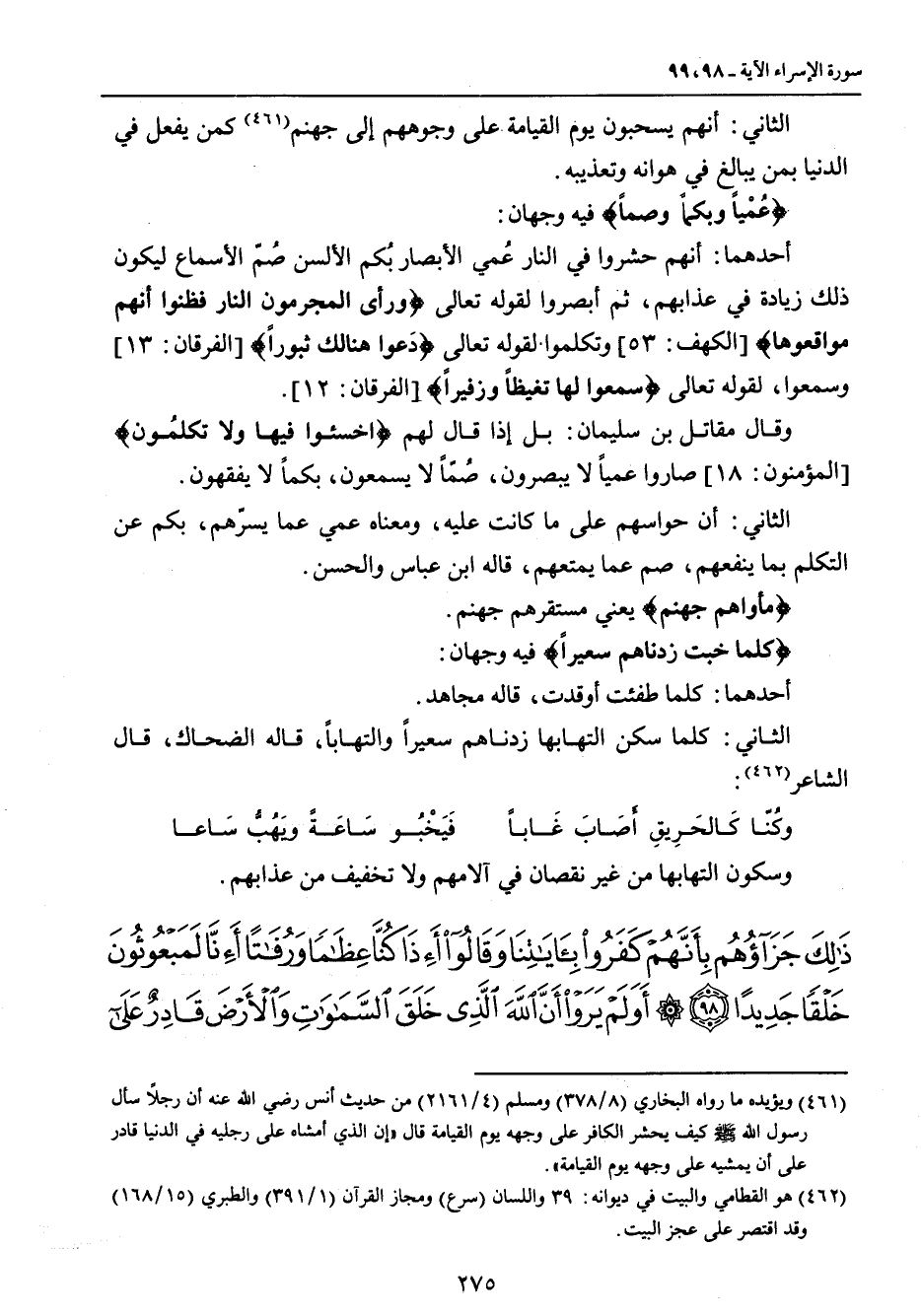 الثاني: أنه يسحبون يوم القيامة على وجوههم إلى جهنم كمن يفعل في الدنيا بمن يبالغ في هوانه وتعذيبه. {عُمْياً وبكماً وصماً} فه وجهان: أحدهما: أنهم حشروا في النار عُمي الأبصار بُكم الألسن صُمّ الأسماع ليكون ذلك يزادة في عذابهم , ثم أبصروا لقوله تعالى {ورأى المجرمون النار فظنوا أنهم مواقعوها} [الكهف: 53] وتكلموا لقوله تعالى {دَعوا هنالك ثبوراً} [الفرقان: 13] وسمعوا , لقوله تعالى {سمعوا لها تغيظاً وزفيراً} [الفرقان: 12]. وقال مقاتل بن سليمان: بل إذا قال لهم {اخسئوا فيها ولا تكلمُون} [المؤمنون: 18] صاروا عمياً لا يبصرون , صُمّاً لا يسمعون , بكماً لا يفقهون. الثاني: أن حواسهم على ما كانت عليه , ومعناه عمي عما يسرّهم , بكم عن التكلم بما ينفعهم , صم عما يمتعهم , قاله ابن عباس والحسن. {مأواهم جهنم} يعني مستقرهم جهنم. {كلما خبت زدناهم سعيراً} فيه وجهان: أحدهما: كلما طفئت أوقدت , قاله مجاهد. الثاني: كلما سكن التهابها زدناهم سعيراً والتهاباً , قاله الضحاك , قال الشاعر:
