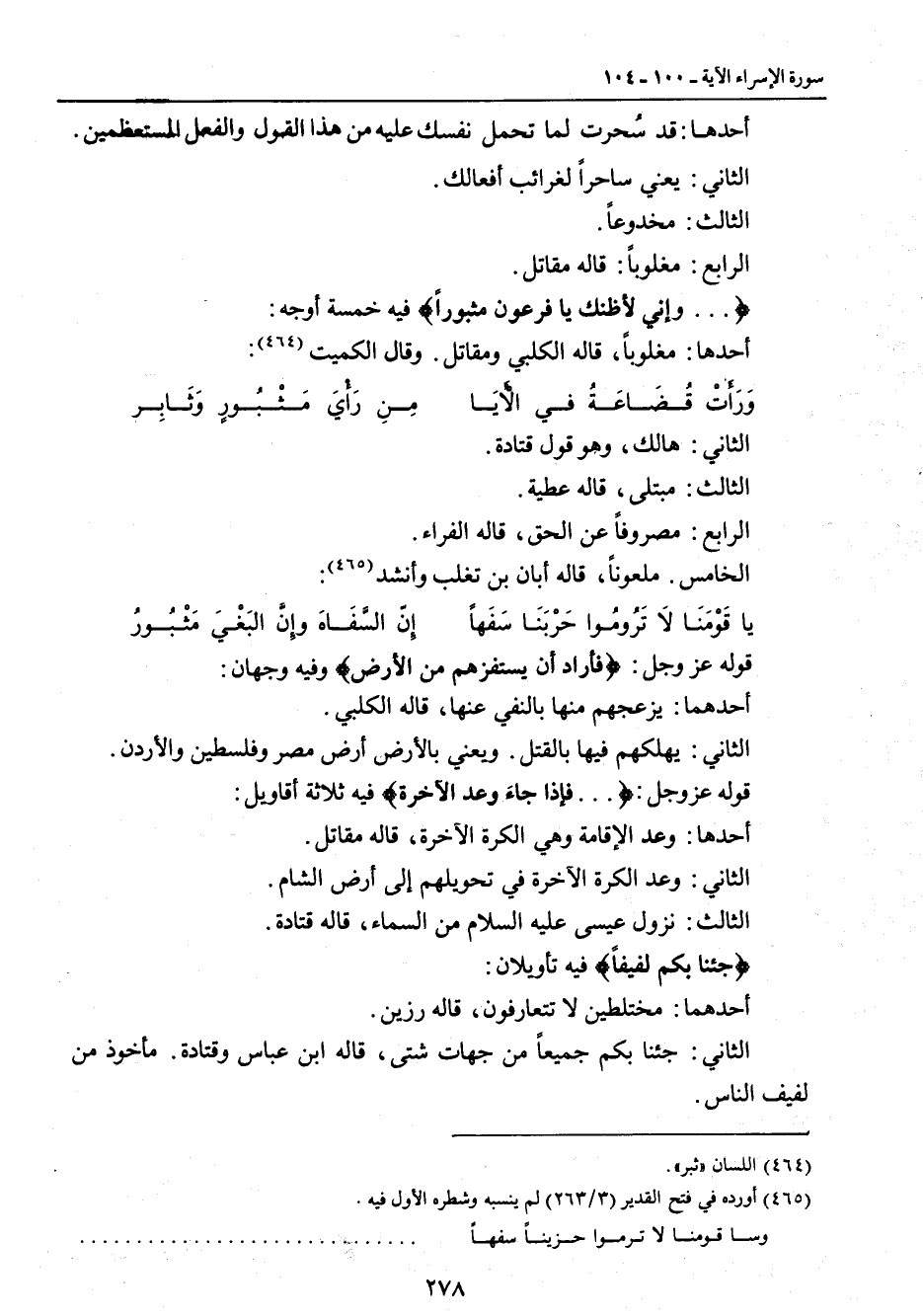 قوله عز وجل: {فأراد أن يستفزهم من الأرض} وفيه وجهان: أحدهما: يزعجهم منها بالنفي عنها , قاله الكلبي. الثاني: يهلكهم فيها بالقتل. ويعني بالأرض مصر وفلسطين والأردن. قوله عز وجل: { ... فإذا جاءَ وعد الآخرة} فيه ثلاثة أقاويل: أحدها: وعد الإقامة وهي الكرة الآخرة , قاله مقاتل. الثاني: وعد الكرة الآخرة في تحويلهم إلى أرض الشام. الثالث: نزول عيسى عليه السلام من السماء , قاله قتادة. {جئنا بكم لفيفاً} فيه تأويلان: أحدهما: مختلطين لا تتعارفون , قاله رزين. الثاني: جئنا بكم جميعاًً من جهات شتى , قاله ابن عباس وقتادة. مأخوذ من لفيف الناس.
