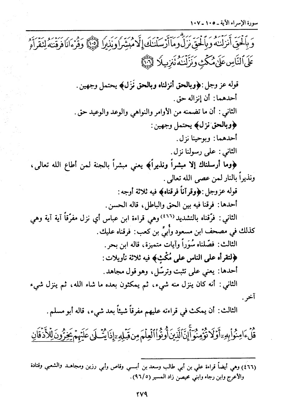 {وبالحق أنزلناه وبالحق نزل وما أرسلناك إلا مبشرا ونذيرا وقرآنا فرقناه لتقرأه على الناس على مكث ونزلناه تنزيلا} قوله عز وجل: {وبالحق أنزلناه وبالحق نَزَل} يحتمل وجهين: أحدهما: أن إنزاله حق. الثاني: أن ما تضمنه من الأوامر والنواهي والوعد والوعيد حق. {وبالحق نزل} يحتمل وجهين: أحدهما: وبوحينا نزل. الثاني: على رسولنا نزل. {وما أرسلناك إلا مبشراً ونذيراً} يعني مبشراً بالجنة لمن أطاع الله تعالى , ونذيراً بالنار لمن عصى الله تعالى. قوله عز وجل: {وقرآناً فرقناه} فيه ثلاثة أوجه: أحدها: فرقنا فيه بين الحق والباطل , قاله الحسن. الثاني: فرّقناه بالتشديد وهي قراءة ابن عباس أي نزل مفرّقاً آية آية وهي كذلك في مصحف ابن مسعود وأُبيِّ بن كعب: فرقناه عليك. الثالث: فصّلناه سُورَاً وآيات متميزة , قاله ابن بحر. {لتقرأه على الناس على مُكْثٍ} فيه ثلاثة تأويلات: أحدها: يعني على تثبت وترسّل , وهو قول مجاهد. الثاني: أنه كان ينزل منه شيء , ثم يمكثون بعد ما شاء الله , ثم ينزل شيء آخر. الثالث: أن يمكث في قراءته عليهم مفرقاً شيئاً بعد شيء , قاله أبو مسلم.