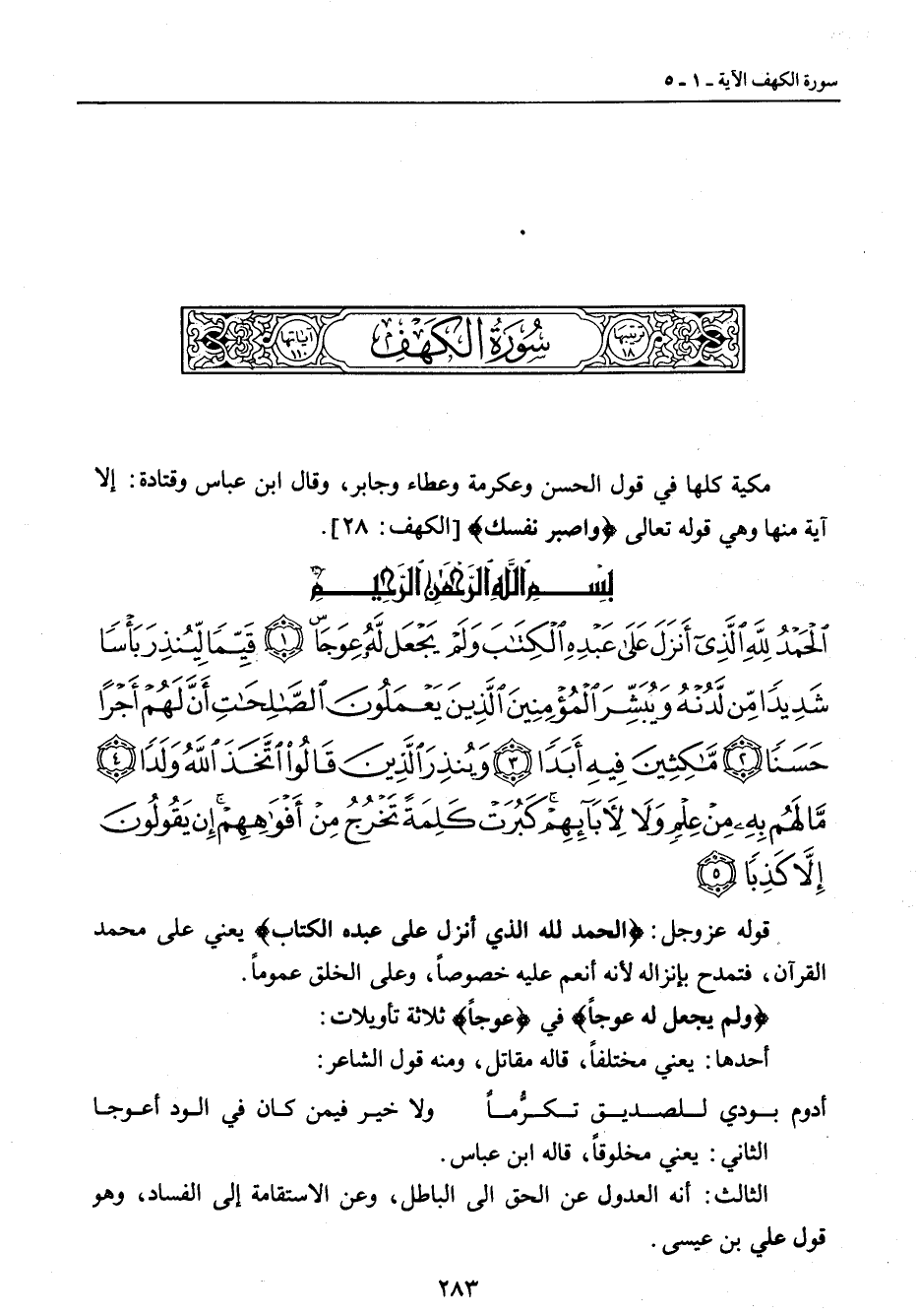 {الحمد لله الذي أنزل على عبده الكتاب ولم يجعل له عوجا قيما لينذر بأسا شديدا من لدنه ويبشر المؤمنين الذين يعملون الصالحات أن لهم أجرا حسنا ماكثين فيه أبدا وينذر الذين قالوا اتخذ الله ولدا ما لهم به من علم ولا لآبائهم كبرت كلمة تخرج من أفواههم إن يقولون إلا كذبا} قوله عز وجل: {الحمد لله الذي أنزل على عبده الكتاب} يعني على محمد القرآن , فتمدح بإنزاله لأنه أنعم عليه خصوصاً , وعلىالخلق عموماً. {ولم يجعل له عوجاً} في {عوجاً} ثلاثة تأويلات: أحدها: يعني مختلفاً , قاله مقاتل , ومنه قول الشاعر:
