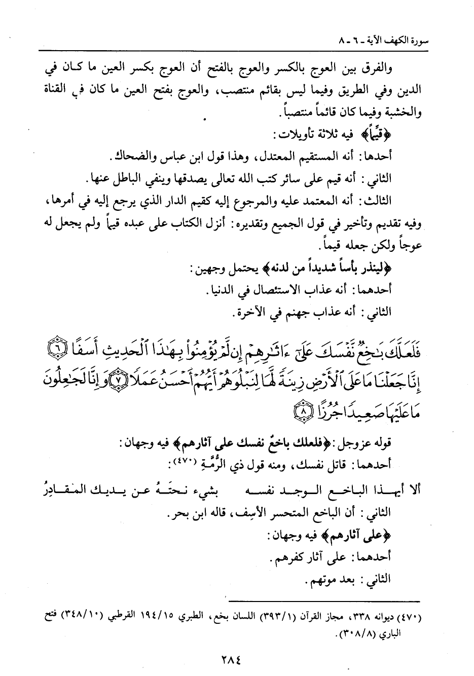 الثاني: أن الباخع المتحسر الأسِف , قاله ابن بحر. {على آثارهم} فيه وجهان: أحدهما: على آثار كفرهم. الثاني: بعد موتهم.