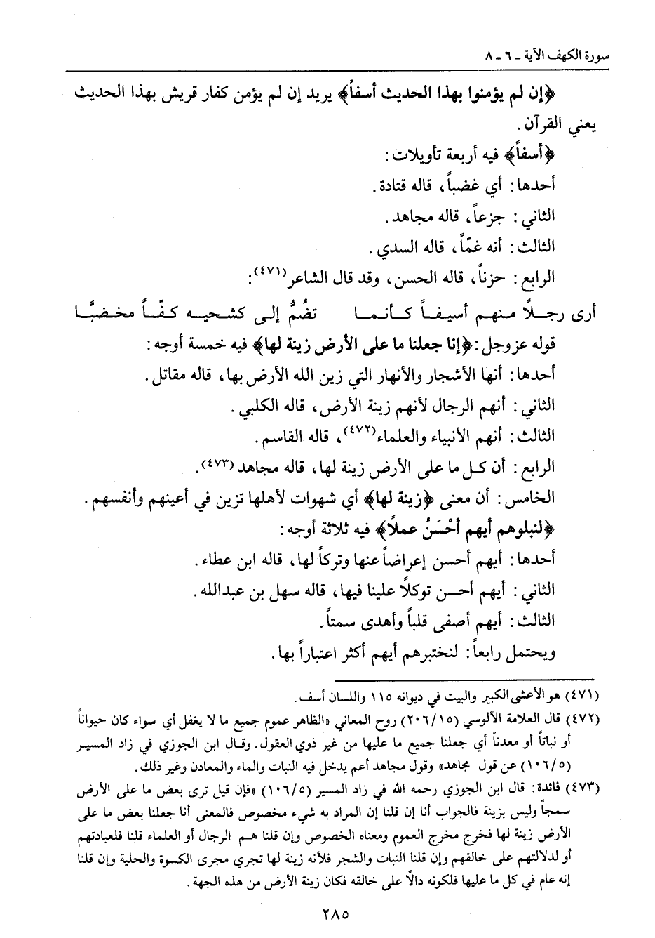 {إن لم يؤمنوا بهذا الحديث أسفاً} يريد إن لم يؤمن كفار قريش بهذا الحديث يعني القرآن. {أسفاً} فيه أربعة تأويلات: أحدها: أي غضباً , قاله قتادة. الثاني: جزعاً , قاله مجاهد. الثالث: أنه غمّاً , قاله السدي. الرابع: حزناً , قاله الحسن , وقد قال الشاعر: