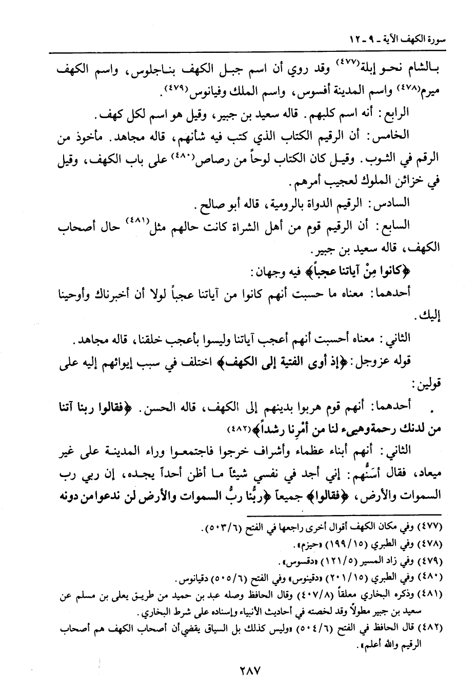 بالشام نحو إبلة وقد روي أن اسم جبل الكهف بناجلوس، واسم الكهف ميرم واسم المدينة أفسوس، واسم الملك وفيانوس. الرابع: أنه اسم كلبهم. قاله سعيد بن جبير , وقيل هو اسم لكل كهف. الخامس: أن الرقيم الكتاب الذي كتب فيه شأنهم , قاله مجاهد. ماخوذ من الرقم في الثوب. وقيل كان الكتاب لوحاً من رصاص على باب الكهف , وقيل في خزائن الملوك لعجيب أمرهم. السادس: الرقيم الدواة بالرومية , قاله أبو صالح. السابع: أن الرقيم قوم من أهل الشراة كانت حالهم مثل حال أصحاب الكهف , قاله سعيد بن جبير. {كانوا مِنْ آياتنا عجباً} فيه وجهان: أحدهما: معناه ما حسبت أنهم كانوا من آياتنا عجباً لولا أن أخبرناك وأوحينا إليك. الثاني: معناه أحسبت أنهم أعجب آياتنا وليسوا بأعجب خلقنا , قاله مجاهد. قوله عز وجل: {إذ أوى الفتية إلى الكهف} اختلف في سبب إيوائهم إليه على قولين: أحدهما: أنهم قوم هربوا بدينهم إلى الكهف , قاله الحسن. {فقالوا ربنا آتنا من لدنك رحمة وهيىء لنا من أمرِنا رشداً}. الثاني: أنهم أبناء عظماء وأشراف خرجوا فاجتمعوا وراء المدينة على غير ميعاد , فقال أسَنُّهم: إني أجد في نفسي شيئاً ما أظن أحداً يجده , إن ربي رب السموات والأرض , {فقالوا} جميعاً {ربُّنا ربُّ السموات والأرض لن ندعوا من دونه