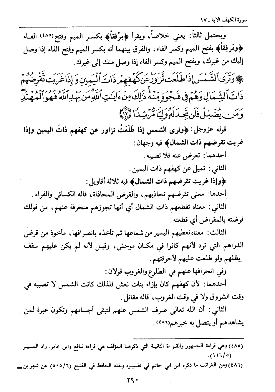 {وترى الشمس إذا طلعت تزاور عن كهفهم ذات اليمين وإذا غربت تقرضهم ذات الشمال وهم في فجوة منه ذلك من آيات الله من يهد الله فهو المهتد ومن يضلل فلن تجد له وليا مرشدا} قوله عز وجل: {وترى الشمس إذا طَلَعَتْ تزوار عن كهفهم ذاتَ اليمين وإذا غربت تقرضهم ذات الشمال} فيه وجهان أحدهما: تعرض عنه فلا تصيبه. الثاني: تميل عن كهفهم ذات اليمين. {وإذا غربت تقرضهم ذات الشمال} فيه ثلاثة أقاويل: أحدها: معنى تقرضهم تحاذيهم , والقرض المحاذاة , قاله الكسائي والفراء. الثاني: معناه تقطعهم ذات الشمال أي أنها تجوزهم منحرفة عنهم , من قولك قرضته بالمقراض أي قطعته. الثالث: معناه تعطيهم اليسير من شعاعها ثم تأخذه بانصرافها , مأخوذ من قرض الدراهم التي ترد لأنهم كانوا في مكان موحش , وقيل لأنه لم يكن عليهم سقف يظلهم ولو طلعت عليهم لأحرقتهم. وفي انحرافها عنهم في الطلوع والغروب قولان: أحدهما: لأن كهفهم كان بإزاء بنات نعش فلذلك كانت الشمس لا تصيبه في وقت الشروق ولا في وقت الغروب , قاله مقاتل. الثاني: أن الله تعالى صرف الشمس عنهم لتبقى أجسامهم وتكون عبر لمن يشاهدهم أو يتصل به خبرهم.
