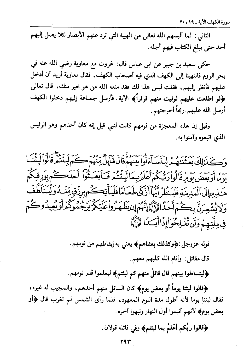 {وكذلك بعثناهم ليتساءلوا بينهم قال قائل منهم كم لبثتم قالوا لبثنا يوما أو بعض يوم قالوا ربكم أعلم بما لبثتم فابعثوا أحدكم بورقكم هذه إلى المدينة فلينظر أيها أزكى طعاما فليأتكم برزق منه وليتلطف ولا يشعرن بكم أحدا إنهم إن يظهروا عليكم يرجموكم أو يعيدوكم في ملتهم ولن تفلحوا إذا أبدا} قوله عز وجل: {وكذلك بعثناهم} يعني به إيقاظهم من نومهم. قال مقاتل: وأنام الله كلبهم معهم. {ليتساءلوا بينهم قال قائلٌ منهم كم لبثتم} ليعلموا قدر نومهم. {قالوا لبثنا يوماً أو بعض يوم} كان السائل منهم أحدهم , والمجيب له غيره , فقال لبثنا يوما لأنه أطول مدة النوم المعهود , فلما رأى الشمس لم تغرب قال {أو بعض يوما} لأنهم أنيموا أول النهار ونبهوا آخره. {قالوا ربُّكم أعْلمُ بما لبثتم} وفي قائله قولان: