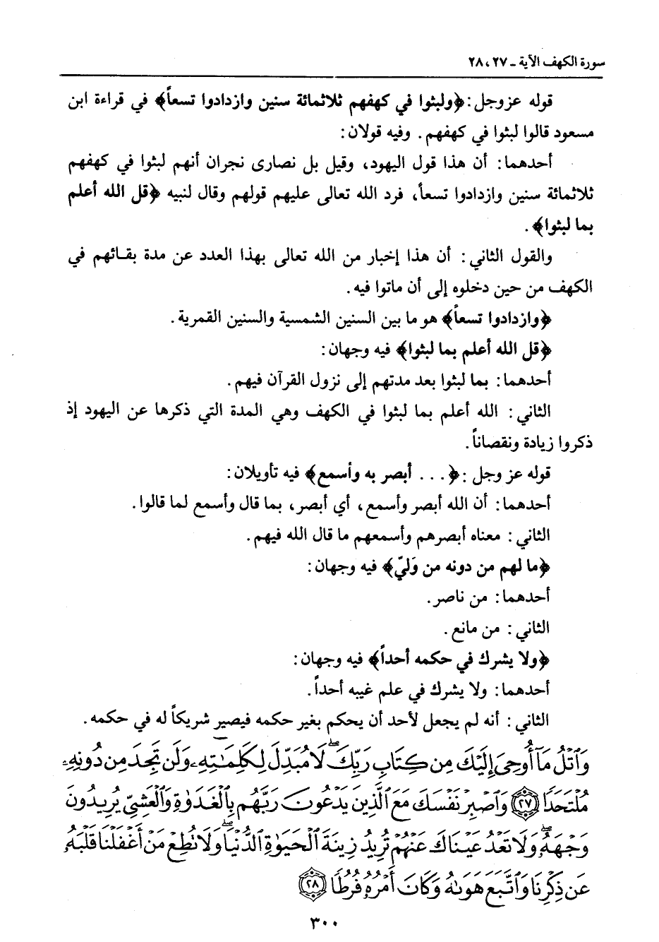 قوله عز وجل: {ولبثوا في كهفهم ثلاثمائة سنين وازدادوا تسعاً} في قراءة ابن مسعود قالوا لبثوا في كهفهم. وفيه قولان: أحدهما: أن هذا قول اليهود , وقيل بل نصارى نجران أنهم لبثوا في كهفهم ثلاثمائة سنين وازدادوا تسعاً , فرد الله تعالى عليهم قولهم وقال لنبيه {قل الله أعلم بما لبثوا} واتلقول الثاني: أن هذا إخبار من الله تعالى بهذا العدد عن مدة بقائهم في الكهف من حين دخلوه إلى ما ماتوا فيه. {وازدادوا تسعاً} هو ما بين السنين الشمسية والسنين القمرية. {قل الله أعلم بما لبثوا} فيه وجهان: أحدهما: بما لبثوا بعد مدتهم إلى نزول القرآن فيهم. الثاني: الله أعلم بما لبثوا في الكهف وهي المدة التي ذكرها عن اليهود إذ ذكروا زيادة ونقصاناً. قوله عز وجل: { ... أبصر به وأسمع} فيه تأويلان: أحدهما: أن الله أبصر وأسمع , أي أبصر , بما قال وأسمع لما قالوا. الثاني: معناه أبصرهم وأسمعهم , ما قال الله فيهم. {ما لهم من دونه من وَليّ} فيه وجهان: أحدهما: من ناصر. الثاني: من مانع. {ولا يشرك في حكمه أحداً} فيه وجهان: أحدهما: ولا يشرك في علم غيبه أحداً. الثاني: أنه لم يجعل لأحد أن يحكم بغير حكمه فيصير شريكاً له في حكمه.
