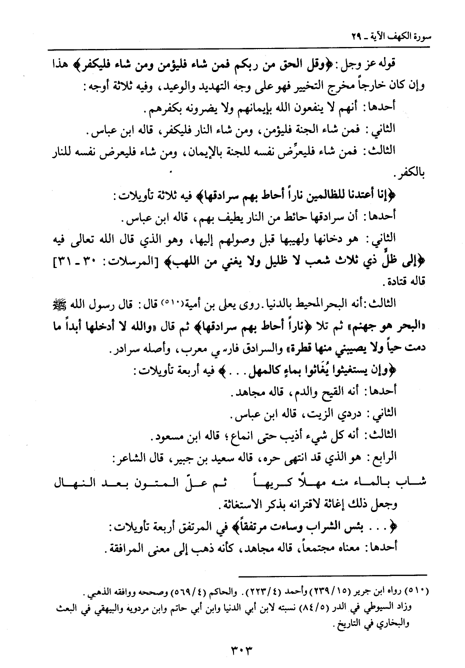 قوله عز وجل: {وقل الحق من ربكم فمن شاء فليؤمن ومن شاء فليكفر} هذا وإن كان خارجاً مخرج التخيير فهو على وجه التهديد والوعيد , وفيه ثلاثة أوجه: أحدها: أنهم لا ينفعون الله بإيمانهم ولا يضرونه بكفرهم. الثاني: فمن شاء الجنة فليؤمن , ومن شاء النار فليكفر , قاله ابن عباس. الثالث: فمن شاء فليعرِّض نفسه للجنة بالإيمان , ومن شاء فليعرض نفسه للنار بالكفر. {إنا أعتدنا للظالمين ناراً أحاط بهم سرادقها} فيه ثلاثة تأويلات: أحدها: أن سرادقها حائط من النار يطيف بهم , قاله ابن عباس. الثاني: هو دخانها ولهيبها قبل وصولهم إليها , وهو الذي قال الله تعالى فيه {إلى ظلٍّ ذي ثلاث شعب لا ظليل ولا يغني من اللهب} [المرسلات: 30 - 31]. قاله قتادة. الثالث: أنه البحر المحيط بالدنيا. روى يعلى بن أمية قال: قال رسول الله صلى الله عليه وسلم (البحر هو جهنم) ثم تلا {ناراً أحاط بهم سرادقها} ثم قال (والله لا أدخلها أبداً ما دمت حياً ولا يصيبني منها قطرة) والسرادق فارسي معرب , واصله سرادر. {وإن يستغيثوا يُغَاثوا بماءٍ كالمهل ... } فيه أربعة تأويلات: أحدها: أنه القيح والدم , قاله مجاهد. الثاني: دردي الزيت , قاله ابن عباس. الثالث: أنه كل شيء أذيب حتى انماع؛ قاله ابن مسعود. الرابع: هو الذي قد انتهى حره , قاله سعيد بن جبير , قال الشاعر: