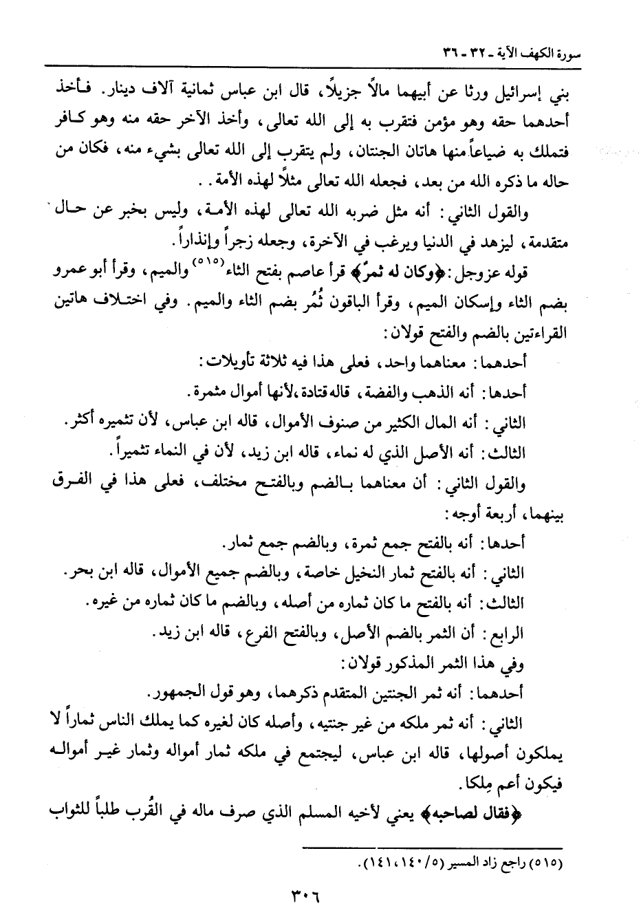 بني إسرائيل ورثا عن أبيهما مالاً جزيلاً , قال ابن عباس ثمانية آلاف دينار. فأخذ أحدهما حقه وهو مؤمن فتقرب به إلى الله تعالى , وأخذ الآخر حقه منه وهو كافر فتملك به ضياعاً منها هاتان الجنتان , ولم يتقرب إلى الله تعالى بشيء منه , فكان من حاله ما ذكره الله من بعد , فجعله الله تعالى مثلاً لهذه الأمة. والقول الثاني: أنه مثل ضربه الله تعالى لهذه الأمة , وليس بخبر عن حال متقدمة , ليزهد في الدنيا ويرغب في الآخرة , وجعله زجراً وإنذاراً. قوله عز وجل: {وكان له ثمرٌ} قرأ عاصم بفتح الثاء والميم , وقرأ أبو عمرو بضم الثاء وإسكان الميم , وقرأ الباقون ثُمُر بضم الثاء والميم. وفي اختلاف هاتين القراءتين بالضم والفتح قولان: أحدهما: معناهما واحد , فعلى هذا فيه ثلاثة تأويلات: أحدها: أنه الذهب والفضة , قاله قتادة , لأنها أموال مثمرة. الثاني: أنه المال الكثير من صنوف الأموال , قاله ابن عباس لأن تثميره أكثر الثالث: أنه الأصل الذي له نماء , قاله ابن زيد , لأن في النماء تثميراً. والقول الثاني: أن معناهما بالضم وبالفتح مختلف , فعلى هذا في الفرق. بينهما , أربعة أوجه: أحدها: أنه بالفتح جمع ثمرة , وبالضم جمع ثمار. الثاني: أنه بالفتح ثمار النخيل خاصة , وبالضم جميع الأموال , قاله ابن بحر. الثالث: أنه بالفتح ما كان ثماره من أصله , وبالضم ما كان ثماره من غيره. الرابع: أن الثمر بالضم الأصل , وبالفتح الفرع , قاله ابن زيد. وفي هذا الثمر المذكور قولان: أحدهما: أنه ثمر الجنتين المتقدم ذكرهما , وهو قول الجمهور. الثاني: أنه ثمر ملكه من غير جنتيه , وأصله كان لغيره كما يملك الناس ثماراً لا يملكون أصولها , قاله ابن عباس , ليجتمع في ملكه ثمار أمواله وثمار غير أمواله فيكون أعم مِلكا. {فقال لصاحبه} يعني لأخيه المسلم الذي صرف ماله في القُرب طلباً للثواب