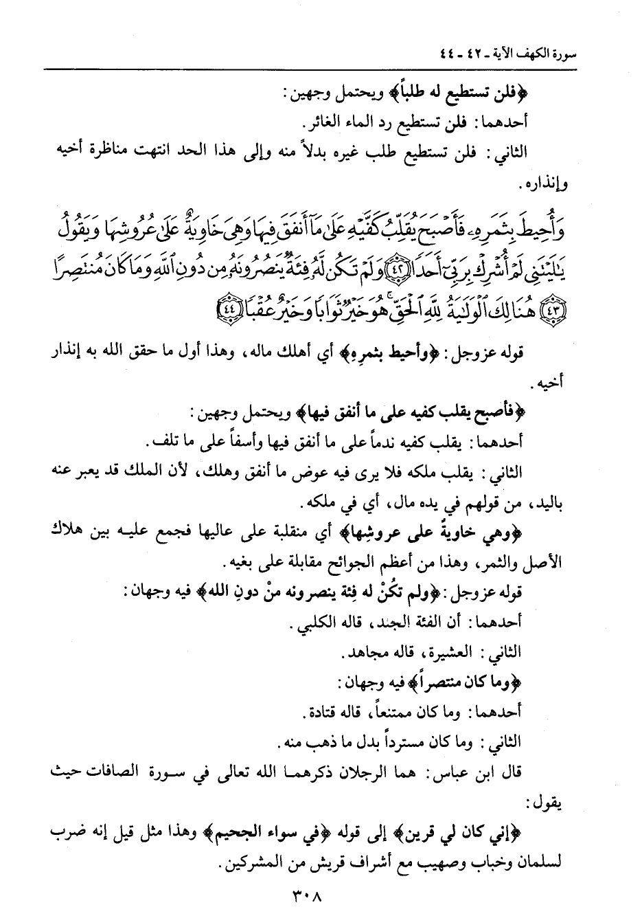 {وأحيط بثمره فأصبح يقلب كفيه على ما أنفق فيها وهي خاوية على عروشها ويقول يا ليتني لم أشرك بربي أحدا ولم تكن له فئة ينصرونه من دون الله وما كان منتصرا هنالك الولاية لله الحق هو خير ثوابا وخير عقبا} قوله عز وجل: {وأحيط بثمرِهِ} أي أهلك ماله , وهذا أول ما حقق الله به إنذار أخيه. {فأصبح يقلب كفيه على ما أنفق فيها} يحتمل وجهين: أحدهما: يقلب كفيه ندماً على ما أنفق فيها وأسفاً على ما تلف. الثاني: يقلب ملكه فلا يرى فيه عوض ما أنفق وهلك , لأن الملك قد يعبر عنه باليد , من قولهم في يده مال , أي في ملكه. {وهي خاويةٌ على عروشِها} أي منقلبة على عاليها فجمع عليه بين هلاك الأصل والثمر , وهذا من أعظم الجوائح مقابلة على بغيه. قوله عز وجل: {ولم تكُنْ له فِئة ينصرونه منْ دونِ الله} فيه وجهان: أحدهما: أن الفئة الجند , قاله الكلبي. الثاني: العشيرة , قاله مجاهد. {وما كان منتصراً} فيه وجهان: أحدهما: وما كان ممتنعاً , قاله قتادة. الثاني: وما كان مسترداً بدل ما ذهب منه. قال ابن عباس: هما الرجلان ذكرهما الله تعالى في سورة الصافات حيث يقول: {إني كان لي قرين} إلى قوله {في سواء الجحيم} وهذا مثل قيل إنه ضرب لسلمان وخباب وصهيب مع أشراف قريش من المشركين.