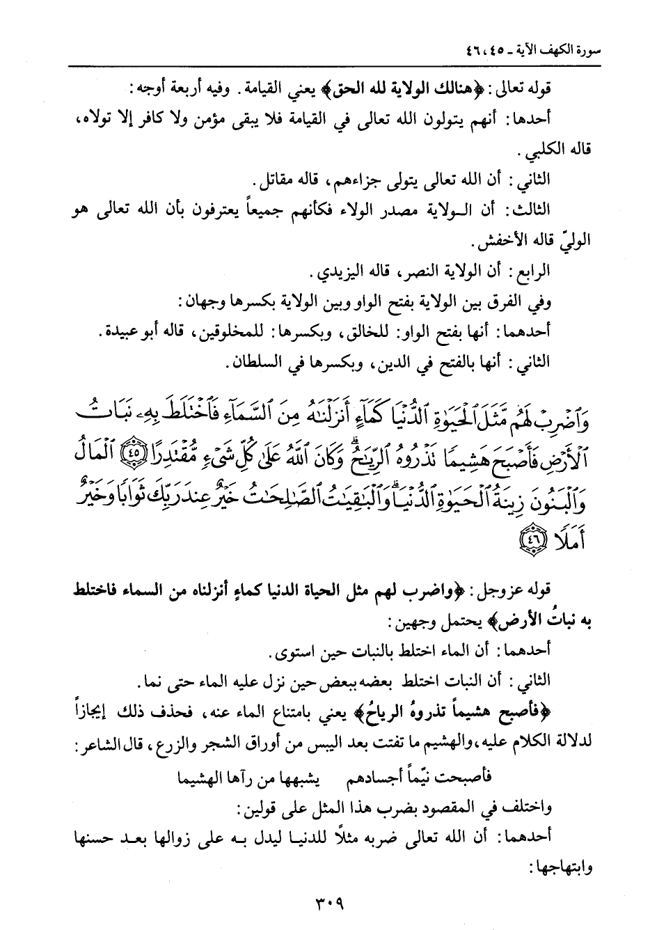{واضرب لهم مثل الحياة الدنيا كماء أنزلناه من السماء فاختلط به نبات الأرض فأصبح هشيما تذروه الرياح وكان الله على كل شيء مقتدرا المال والبنون زينة الحياة الدنيا والباقيات الصالحات خير عند ربك ثوابا وخير أملا} قوله عز وجل: {واضرب لهم مثل الحياة الدنيا كماءٍ أنزلناه من السماء فاختلط به نباتُ الأرض} يحتمل وجهين: أحدهما: أن الماء اختلط بالنبات حين استوى. الثاني: أن النبات اختلط بعضه ببعض حين نزل عليه الماء حتى نما. {فأصبح هشيماً تذروهُ الرياحُ} يعني بامتناع الماء عنه , فحذف ذلك إيجازاً لدلالة الكلام عليه , والهشيم ما تفتت بعد اليبس من أوراق الشجر والزرع , قال الشاعر: