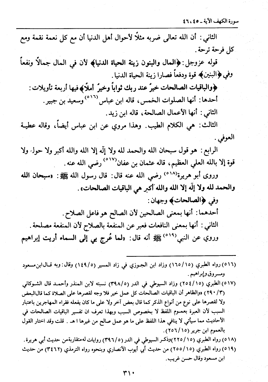 الثاني: أن الله تعالى ضربه مثلاُ لأحوال أهل الدنيا أن مع كل نعمة نقمة ومع كل فرحة ترحة. قوله عز وجل: {المال والبنون زينة الحياة الدنيا} لأن في المال جمالاً ونفعاً وفي {البنين} قوة ودفعاً فصارا زينة الحياة الدنيا. {والباقيات الصالحات خيرٌ عند ربك ثواباً وخيرٌ أملاً} فيها أربعة تأويلات: أحدها: أنها الصلوات الخمس , قاله ابن عباس وسعيد بن جبير. الثاني: أنها الأعمال الصالحة , قاله ابن زيد. الثالث: هي الكلام الطيب. وهذا مروي عن ابن عباس أيضاً , وقاله عطية العوفي. الرابع: هو قول سبحان الله والحمد لله ولا إله إلا الله والله أكبر ولا حول ولا قوة إلا بالله العلي العظيم , قاله عثمان بن عفان رضي الله عنه. وروى أبو هريرة رضي الله عنه قال: قال رسول الله صلى الله عليه وسلم: (سبحان الله والحمد لله ولا إله إلا الله والله أكبر هي الباقيات الصالحات). وفي {الصالحات} وجهان: أحدهما: أنها بمعنى الصالحين لأن الصالح هو فاعل الصلاح. الثاني: أنها بمعنى النافعات فعبر عن المنفعة بالصلاح لأن المنفعة مصلحة. وروي عن النبي صلى الله عليه وسلم أنه قال: (لما عُرج بي إلى السماء أريت إبراهيم