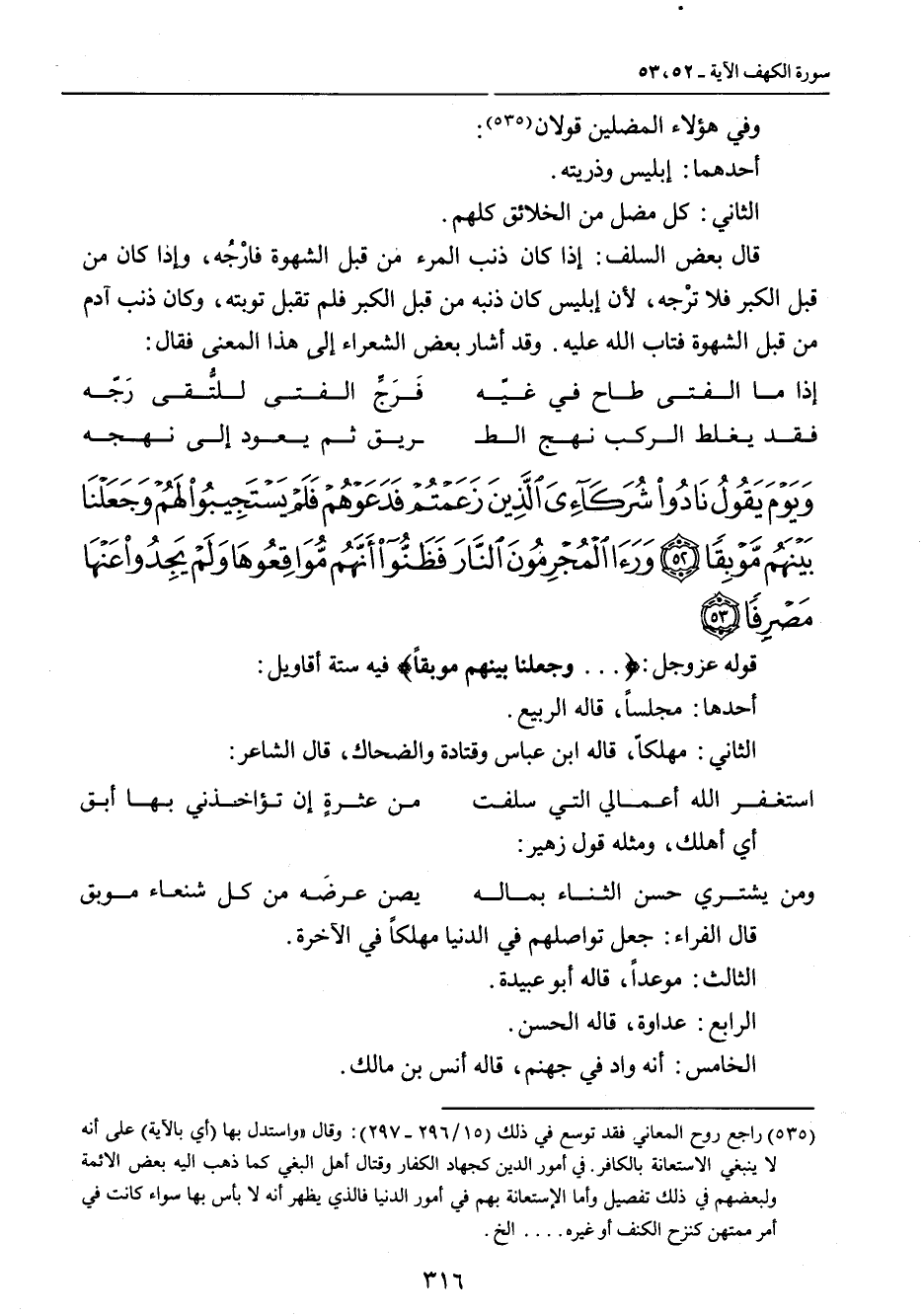 {ويوم يقول نادوا شركائي الذين زعمتم فدعوهم فلم يستجيبوا لهم وجعلنا بينهم موبقا ورأى المجرمون النار فظنوا أنهم مواقعوها ولم يجدوا عنها مصرفا} قوله عز وجل: { ... وجعلنا بينهم موبقاً} فيه ستة أقاويل: أحدها: مجلساً , قاله الربيع. الثاني: مهلكاً , قاله ابن عباس وقتادة والضحاك , قال الشاعر: