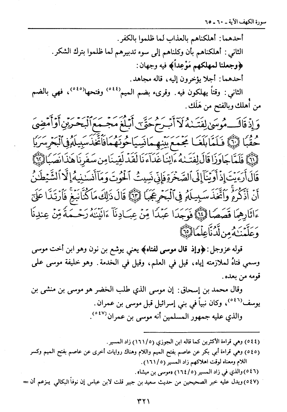 {وإذ قال موسى لفتاه لا أبرح حتى أبلغ مجمع البحرين أو أمضي حقبا فلما بلغا مجمع بينهما نسيا حوتهما فاتخذ سبيله في البحر سربا فلما جاوزا قال لفتاه آتنا غداءنا لقد لقينا من سفرنا هذا نصبا قال أرأيت إذ أوينا إلى الصخرة فإني نسيت الحوت وما أنسانيه إلا الشيطان أن أذكره واتخذ سبيله في البحر عجبا قال ذلك ما كنا نبغ فارتدا على آثارهما قصصا فوجدا عبدا من عبادنا آتيناه رحمة من عندنا وعلمناه من لدنا علما} قوله عز وجل: {وإذا قال موسى لفتاه} يعني يوشع بن نون وهو ابن أخت موسى وسمي فتاهُ لملازمته إياه , قيل في العلم , وقيل في الخدمة , وهو خليفة موسى على قومه من بعده. وقال محمد بن إسحاق: إن موسى الذي طلب الخضر هو موسى بن منشى بن يوسف , وكان نبياً في بني إسرائيل قبل موسى بن عمران. والذي عليه جمهور المسلمين أنه موسى بن عمران.