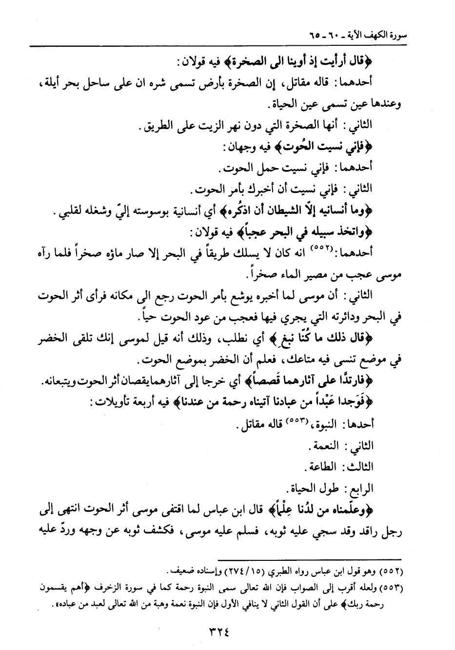 {قال أرأيت إذ أوينا إلى الصخرة} فيه قولان: أحدهما: قاله مقاتل , إن الصخرة بأرض تسمى شره ان على ساحل بحر أيلة , وعندها عين تسمى عين الحياة. الثاني: أنها الصخرة التي دون نهر الزيت على الطريق. {فإني نسيت الحُوت} فيه وجهان: أحدهما: فإني نسيت حمل الحوت. الثاني: فإني نسيت أن أخبرك بأمر الحوت. {وما أنسانيه إلاّ الشيطان أن اذكُره} أي أنسانية بوسوسته إليّ وشغله لقلبي. {واتخذ سبيله في البحر عجباً} فيه قولان: أحدهما: انه كان لا يسلك طريقاً في البحر إلا صار ماؤه صخراً فلما رآه موسى عجب من مصير الماء صخراً. الثاني: أن موسى لما أخبره يوشع بأمر الحوت رجع إلى مكانه فرأى أثر الحوت في البحر ودائرته التي يجري فيها فعجب من عود الحوت حياً. {قال ذلك ما كُنّا نبغِ} أي نطلب , وذلك أنه قيل لموسى إنك تلقى الخضر في موضع تنسى فيه متاعك , فعلم أن الخضر بموضع الحوت. {فارتدَّا على آثارهما قَصصاً} أي خرجا إلى آثارهما يقصان أثر الحوت ويتبعانه. {فَوَجداَ عبْداً من عبادنا آتيناه رحمة من عندنا} فيه أربعة تأويلات: أحدها: النبوة , قاله مقاتل: الثاني: النعمة. الثالث: الطاعة. الرابع: طول الحياة. {وعلّمناه من لدُنا عِلْماً} قال ابن عباس لما اقتفى موسى أثر الحوت انتهى إلى رجل راقد وقد سجي عليه ثوبه , فسلم عليه موسى , فكشف ثوبه عن وجهه وردّ عليه