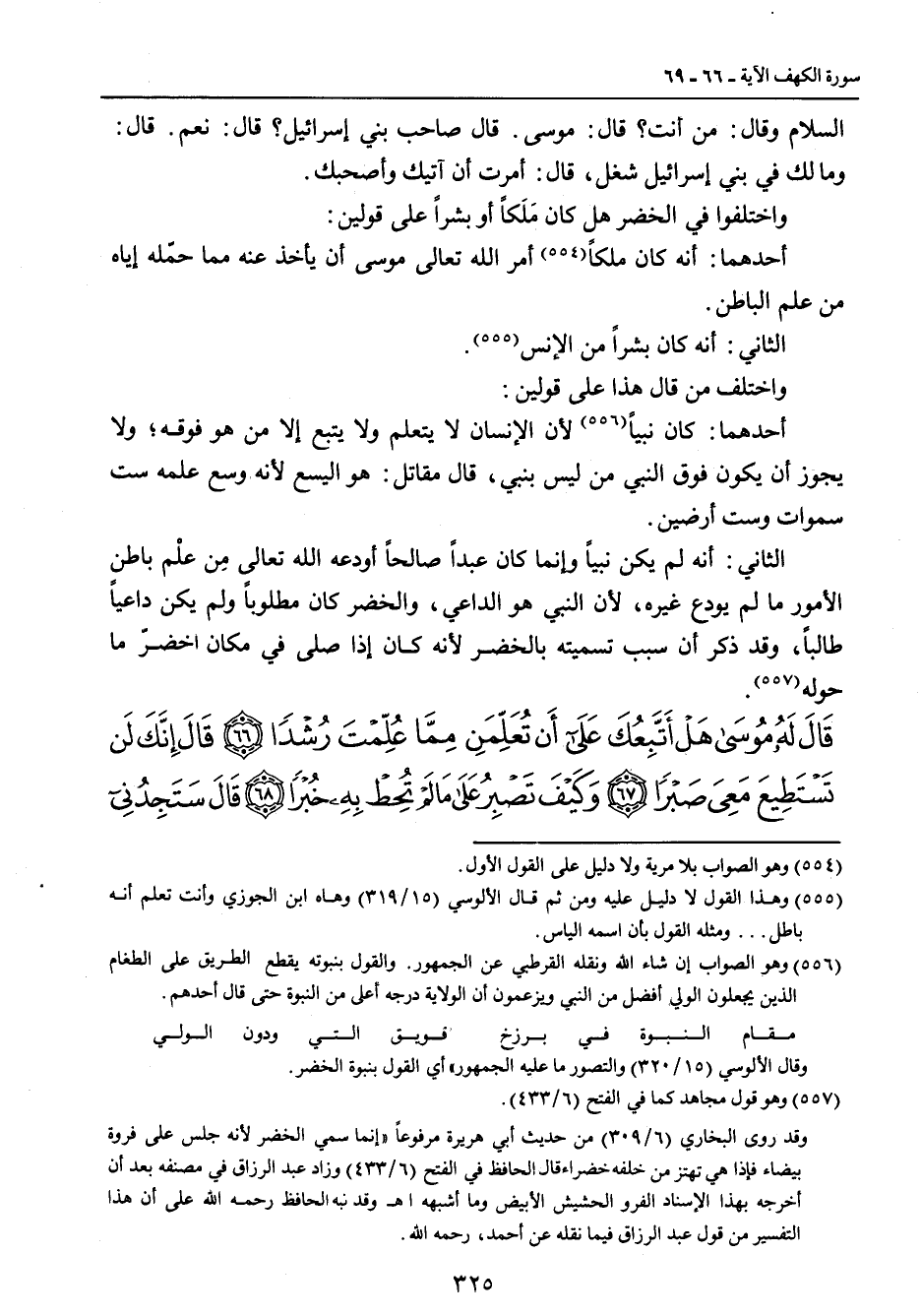السلام وقال: من أنت؟ قال: موسى. قال صاحب بني إسرائيل؟ قال: نعم. قال: وما لك في بني إسرائيل شغل , قال: أمرت أن آتيك وأصحبك. واختلفوا في الخضر هل كان مَلَكاً أو بشراً على قولين: أحدهما: أنه كان ملكاً أمر الله تعالى موسى أن يأخذ عنه مما حمّله إياه من علم الباطن. الثاني: أنه كان بشراً من الإنس. واختلف من قال هذا على قولين: أحدهما: كان نبياً لأن الإنسان لا يتعلم ولا يتبع إلا من هو فوقه؛ ولا يجوز أن يكون فوق النبي من ليس بنبي , قال مقاتل: هو ليسع لأنه وسع علمه ست سموات وست أرضين. الثاني: أنه لم يكن نبياً وإنما كان عبداً صالحاً أودعه الله تعالى مِن علْم باطن الأمور ما لم يودع غيره , لأن النبي هو الداعي , والخضر كان مطلوباً ولم يكن داعياً طالباً , وقد ذكرأن سبب تسميته بالخضر لأنه كانه إذا صلى في مكان اخضرّ ما حوله.