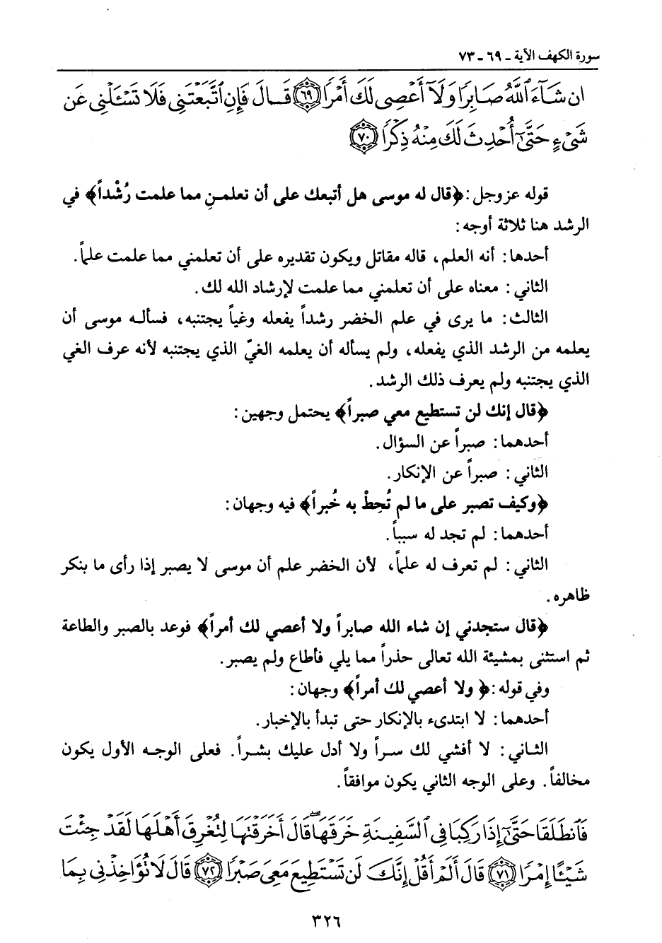 إن شاء الله صابرا ولا أعصي لك أمرا قال فإن اتبعتني فلا تسألني عن شيء حتى أحدث لك منه ذكرا} قوله عز وجل: {قال له موسى هل أتبعك على أن تعلمنِ مما علمت رُشْداً} في الرشد هنا ثلاثة أوجه: أحدها: أنه العلم , قاله مقاتل ويكون تقديره على أن تعلمني مما علمت علماً. الثاني: معناه على أن تعلمني مما علمت لإرشاد الله لك. الثالث: ما يرى في علم الخضر رشداً يفعله وغياً يجتنبه , فسأله موسى أن يعلمه من الرشد الذي يفعله , ولم يسأله أن يعلمه الغيّ الذي يجتنبه لأنه عرف الغي الذي يجتنبه ولم يعرف ذلك الرشد. {قال إنك لن تستطيع معي صبراً} يحتمل وجهين: أحدهما: صبراً عن السؤال. الثاني: صبراً عن الإنكار. {وكيف تصبر على ما لم تُحِطْ به خُبراً} فيه وجهان: أحدهما: لم تجد له سبباً. الثاني: لم تعرف له علماً , لأن الخضر علم أن موسى لا يصبر إذا رأى ما بنكر ظاهره. {قال ستجدني إن شاء الله صابراً ولا أعصي لك أمراً} فوعد بالصبر والطاعة ثم استثنى بمشيئة الله تعالى حذراً مما يلي فأطاع ولم يصبر. وفي قوله: {ولا أعصي لك أمراً} وجهان: أحدهما: لا ابتدىء بالإنكار حتى تبدأ بالإخبار. الثاني: لا أفشي لك سراً ولا أدل عليك بشراً. فعلى الوجه الأول يكون مخالفاً. , على الوجه الثاني: يكون موافقاً.