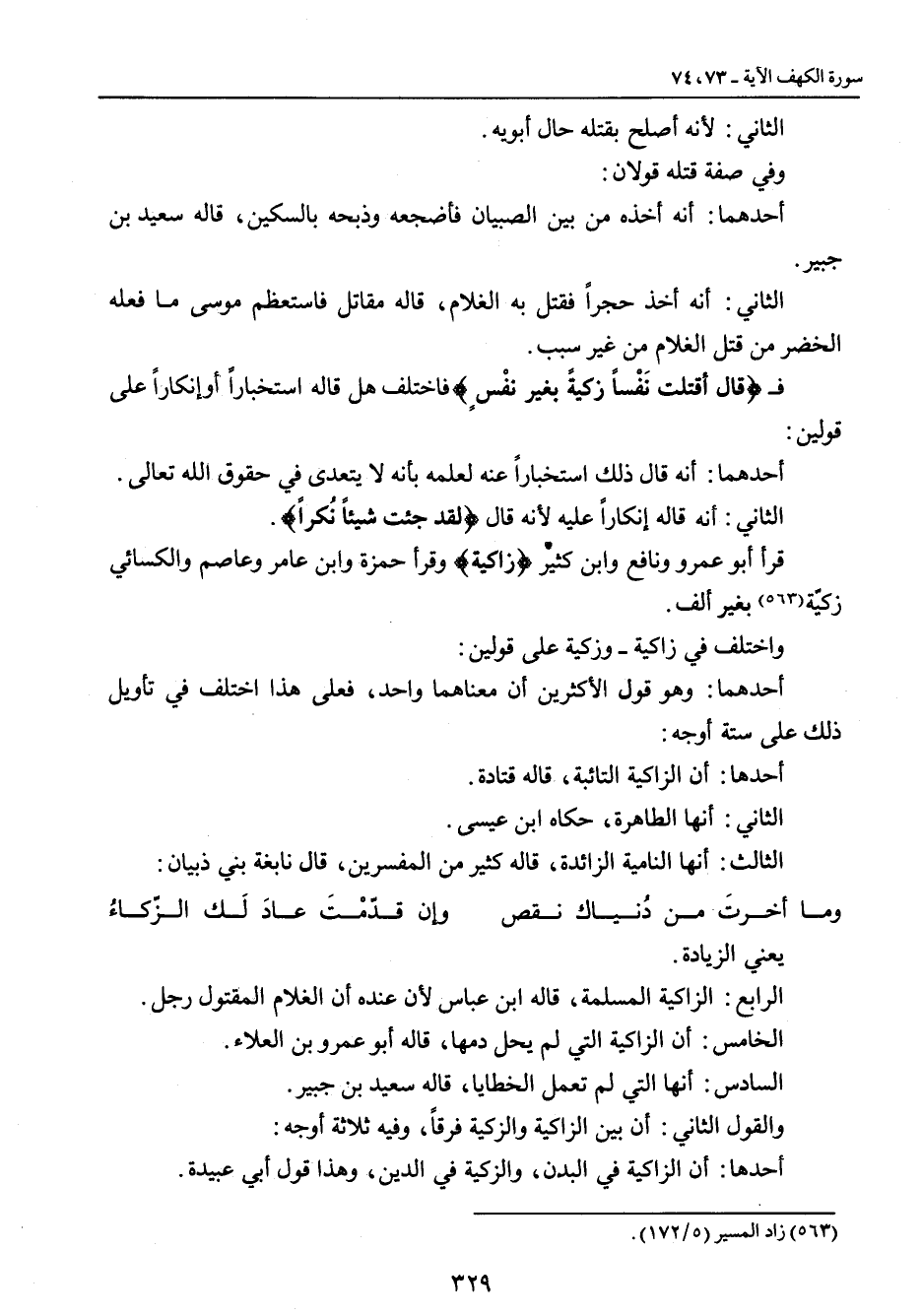 يعني الزيادة. الرابع: الزاكية المسلمة , قاله ابن عباس لأن عنده أن الغلام المقتول رجل. الخامس: أن الزاكية التي لم يحل دمها , قاله أبو عمرو بن العلاء. السادس: أنها التي لم تعمل الخطايا , قاله سعيد بن جبير. والقول الثاني: أن بين الزاكية والزكية فرقاً، وفيه ثلاثة أوجه: أحدها: أن الزاكية في البدن، والزكية في الدين، وهذا قول أبي عبيدة.