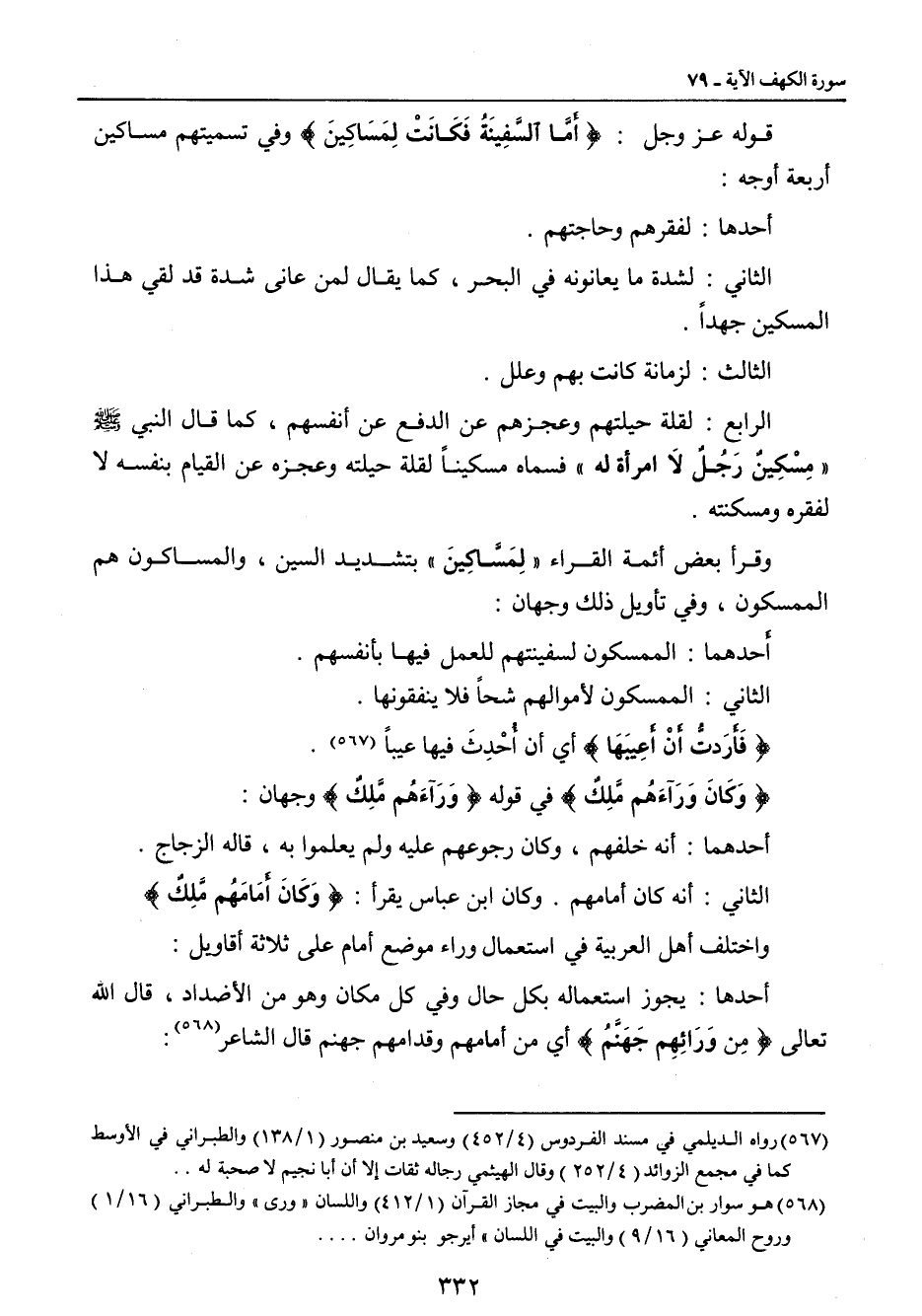 قوله عز وجل: {أَمَّا السَّفِينَةُ فَكَانَتْ لِمَسَاكِينَ} وفي تسميتهم مساكين أربعة أوجه: أحدها: لفقرهم وحاجتهم. الثاني: لشدة ما يعانونه في البحر , كما يقال لمن عانى شدة قد لقي هذا المسكين جهداً. الثالث: لزمانة كانت بهم وعلل. الرابع: لقلة حيلتهم وعجزهم عن الدفع عن أنفسهم , كما قال النبي صلى الله عليه وسلم (مِسْكِينٌ رَجُلٌ لاَ امرأة له) فسماه مسكيناً لقلة حيلته وعجزه عن القيام بنفسه لا لفقره ومسكنته. وقرأ بعض أئمة القراء (لِمَسَّاكِينَ) بتشديد السين , والمساكون هم الممسكون , وفي تأويل ذلك وجهان: أَحدهما: لممسكون لسفينتهم للعمل فيها بأنفسهم. الثاني: الممسكون لأموالهم شحاً فلا ينفقونها. {فَأَرَدتُّ أَنْ أَعِيبَهَا} أي أن أُحْدِثَ فيها عيباً. {وَكَانَ وَرَآءَهُم مَّلِكٌ} في قوله {وَرَآءَهُم مَّلِكٌ} وجهان: أحدهما: أنه خلفهم , وكان رجوعهم عليه ولم يعلموا به , قاله الزجاج. الثاني: أنه كان أمامهم. وكان ابن عباس يقرأ: {وَكَانَ أَمَامَمُم مَّلِكٌ} واختلف أهل العربية في استعمال وراء موضع أمام على ثلاثة أقاويل: أحدها: يجوز استعماله بكل حال وفي كل مكان وهو من الأضداد , قال الله تعالى {مِن وَرَائِهِم جَهَنَّمُ} أي من أمامهم وقدامهم جهنم قال الشاعر: