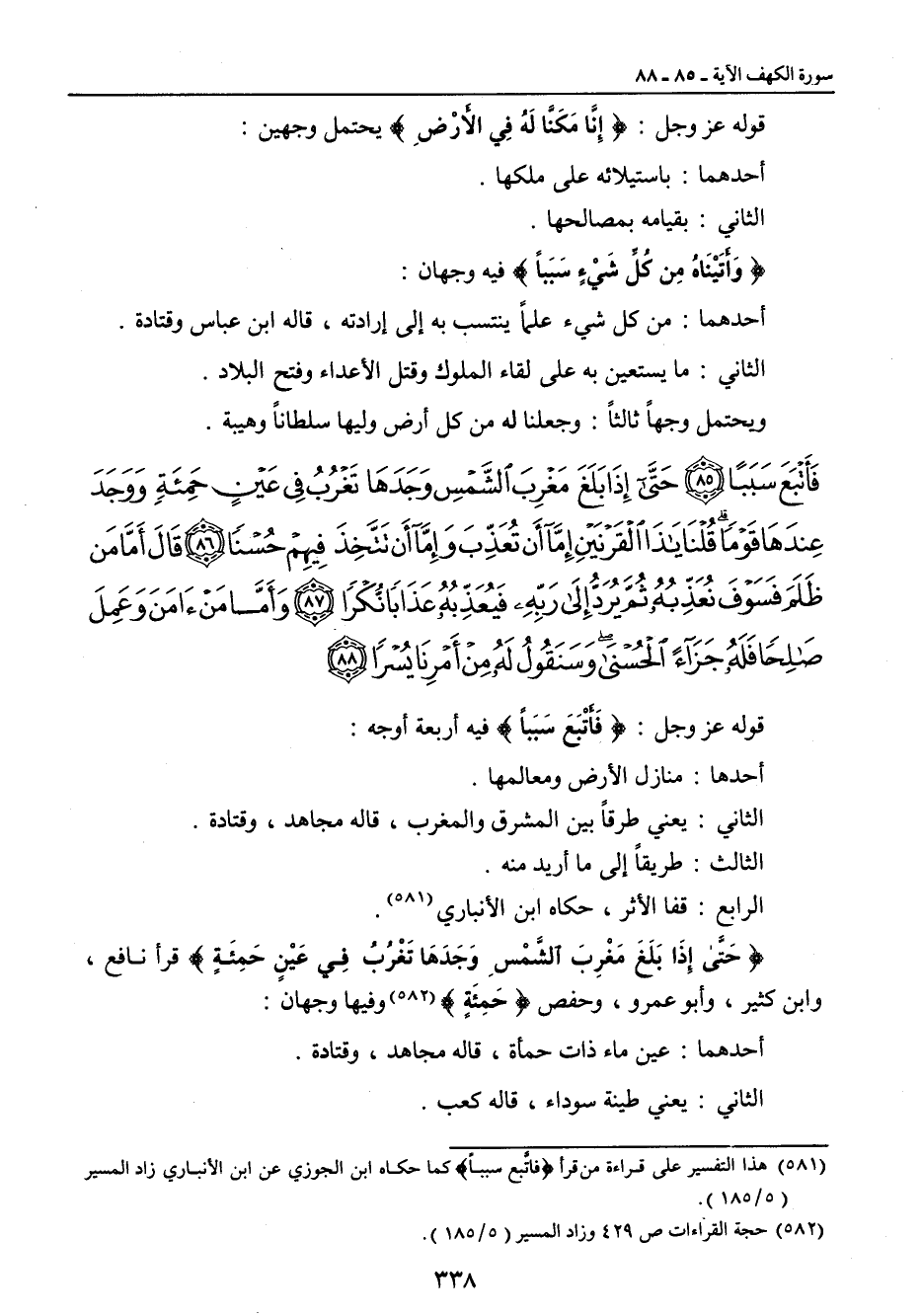 {فأتبع سببا حتى إذا بلغ مغرب الشمس وجدها تغرب في عين حمئة ووجد عندها قوما قلنا يا ذا القرنين إما أن تعذب وإما أن تتخذ فيهم حسنا قال أما من ظلم فسوف نعذبه ثم يرد إلى ربه فيعذبه عذابا نكرا وأما من آمن وعمل صالحا فله جزاء الحسنى وسنقول له من أمرنا يسرا} قوله عز وجل: {فَأَتْبَعَ سَبَاً} فيه أربعة أوجه: أحدها: منازل الأرض ومعالمها. الثاني: يعني طرقاً بين المشرق والمغرب , قاله مجاهد , وقتادة. الثالث: طريقاً إلى ما أريد منه. الرابع: قفا الأثر , حكاه ابن الأنباري. {حَتَّى إِذَا بَلَغَ مَغْرِبَ الشَّمْسِ وَجَدَهَا تَغْرُبُ فِي عَيْنٍ حَمِئَةٍ} قرأ نافع , وابن كثير , وأبو عمرو , وحفص {حَمِئَةٍ} وفيها وجهان: أحدهما: عين ماء ذات حمأة , قاله مجاهد , وقتادة. الثاني: يعني طينة سوداء، خبرا قاله كعب.