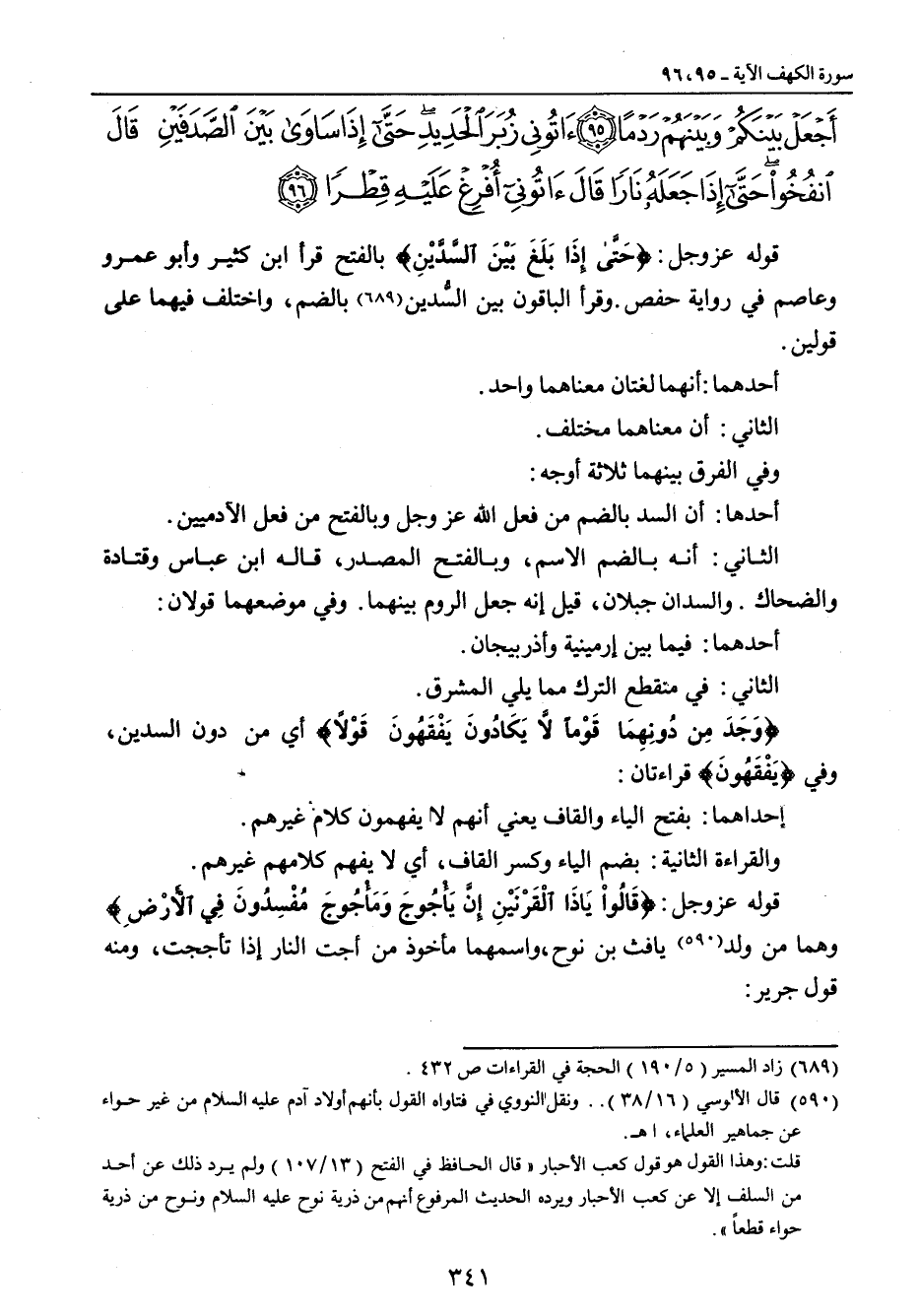 أجعل بينكم وبينهم ردما آتوني زبر الحديد حتى إذا ساوى بين الصدفين قال انفخوا حتى إذا جعله نارا قال آتوني أفرغ عليه قطرا} قوله عز وجل: {حَتَّى إِذَا بَلَغَ بَيْنَ السَّدَّيْنِ} بالفتح قرأ ابن كثير وابو عمرو وعاصم في رواية حفص. وقرأ الباقون بين السُّدين وبالضم , واختلف فيهما على قولين. أحدهما: أنهما لغتان معناهما واحد. الثاني: أن معناهما مختلف. وفي الفرق بينهما ثلاثة أوجه: أحدها: أن السد بالضم من فعل الله عز وجل وبالفتح من فعل الآدميين. الثاني: أنه بالضم الاسم , وبالفتح المصدر , قاله ابن عباس وقتادة والضحاك. والسدان جبلان , قيل إنه جعل الروم بينهما , وفي موضعهما قولان: أحدهما: فيما بين إرمينية وأذربيجان. الثاني: في منقطع الترك مما يلي المشرق. {وَجَدَ مِن دُونِهِمَا قَوْماً لاَّ يَكَادُونَ يَفْقَهُونَ قَوْلاً} أي من دون السدين , وفي {يَفْقَهُونَ} قراءتان: إحداهما: بفتح الياء والقاف يعني أنهم لا يفهمون كلام غيرهم. والقراءة الثانية: بضم الياء وكسر القاف , أي لا يفهم كلامهم غيرهم. قوله عز وجل: {قَالُواْ يَاذَا الْقَرْنَيْنِ إِنَّ يَأْجُوجَ وَمَأْجُوجَ مُفْسِدُونَ فِي الأَرْضِ} وهما من ولد يافث بن نوح , واسمهما مأخوذ من أجت النار إذا تأججت , ومنه قول جرير: