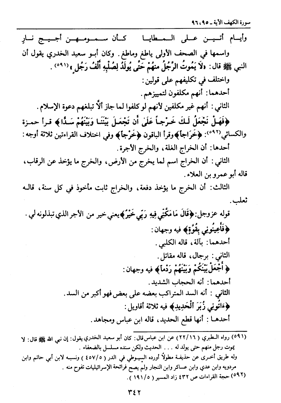 واسمها في الصحف الأولى ياطغ وماطغ. وكان أبو سعيد الخدري يقول أن النبي صلى الله عليه وسلم قال: (لاَ يَمُوتُ الرَّجُلُ منهُمْ حتى يُولَدُ لِصُلْبِهِ أَلْفُ رَجُلٍ). واختلف في تكليفهم على قولين: أحدهما: أنهم مكلفون لتمييزهم. الثاني: أنهم غير مكلفين لأنهم لو كلفوا لما جاز ألاَّ تبلغهم دعوة الإسلام. {فَهَلْ نَجْعَلُ لَكَ خَرْجاً عَلَى أَن تَجْعَلَ بَيْنَنَا وَبَيْنَهُمْ سَدّاً} قرأ حمزة والكسائي: {خَرَاجاً} وقرأ الباقون {خَرْجاً} وفي اختلاف القراءتين ثلاثة أوجه: أحدها: أن الخراج الغلة , والخرج الأجرة. الثاني: أن الخراج اسم لما يخرج من الأرض , والخرج ما يؤخذ عن الرقاب , قاله أبو عمرو بن العلاء. الثالث: أن الخرج ما يؤخذ دفعة , والخراج ثابت مأخوذ في كل سنة , قاله ثعلب. قوله عز وجل: {قَالَ مَا مَكَّنِّي فِيهِ رَبِّي خَيْرٌ} يعني خير من الأجر الذي تبذلونه لي. {فَأَعِينُونِي بِقُوَّةٍ} فيه وجهان: أحدهما: بآلة , قاله الكلبي. الثاني: برجال , قاله مقاتل. {أَجْعَلْ بَيْنَكُمْ وَبَيْنَهُمْ رَدْماً} فيه وجهان: أحدهما: أنه الحجاب الشديد. الثاني: أنه السد المتراكب بعضه على بعض فهو أكبر من السد. {ءاتُونِي زُبَرَ الْحَدِيدِ} فيه ثلاثة أقاويل: أحدها: أنها قطع الحديد , قاله ابن عباس ومجاهد.