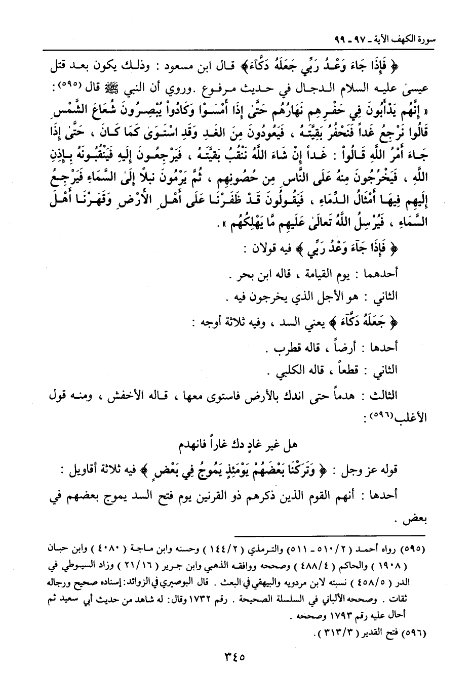 {فَإِذَا جَاءَ وَعْدُ رَبِّي جَعَلَهُ دَكَّاءَ} قال ابن مسعود: وذلك يكون بعد قتل عيسى عليه السلام الدجال في حديث مرفوع. وروي أن النبي صلى الله عليه وسلم قال: (إِنَّهُم يَدْأَبُونَ فِي حَفْرِهِم نَهَارُهُم حَتَّى إِذَا أَمْسَوْا وَكَادُواْ يُبْصِرُونَ شُعَاعَ الشَّمْسِ قَالُوا نَرْجِعُ غَداً فَنَحْفُرُ بَقِيَّتَهُ , فَيَعُودُونَ مِنَ الغَدِ وَقَدِ اسْتَوَى كَمَا كَانَ , حَتَّى إِذَا جَاءَ أَمْرُ اللَّهِ قَالُواْ: غَداً إِنْ شَاءَ اللَّهُ نَنْقُبُ بَقيَّتَهُ , فَيَرْجِعُونَ إِلَيهِ فَيَنْقُبُونَهُ فِإِذِنِ اللَّهِ , فَيَخْرُجُونَ مِنهُ عَلَى النَّاسِ مِن حُصُونِهِم , ثُمَّ يَرْمُونَ نبلاً إِلَى السَّمَاءِ فِيَرْجِعُ إِلَيهِم فِيهَا أَمْثَالُ الدِّمَاءِ , فَيَقُولُونَ قَدْ ظَفَرْنَا عَلَى أَهْلِ ألأَرْضِ وَقَهَرْنَا أَهْلَ السَّمَاءِ , فَيُرْسِلُ اللَّهُ تَعالَى عَلَيهِم مَّا يَهْلِكُهُم). {فَإِذَا جَآءَ وَعْدُ رَبِّي} فيه قولان: أحدهما: يوم القيامة , قاله ابن بحر. الثاني: هو الأجل الذي يخرجون فيه. {جَعَلَهُ دَكَّآءَ} يعني السد , وفيه ثلاثة أوجه: أحدها: أرضاً , قاله قطرب. الثاني: قطعاً , قاله الكلبي. الثالث: هدماً حتى اندك بالأرض فاستوى معها , قاله الأخفشس , ومنه قول الأغلب: