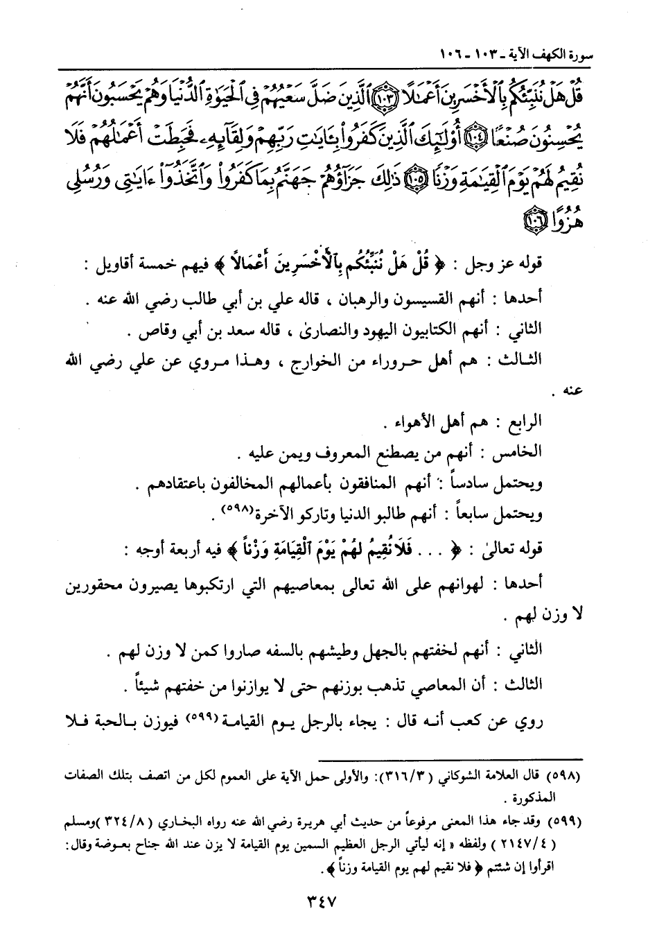 {قل هل ننبئكم بالأخسرين أعمالا الذين ضل سعيهم في الحياة الدنيا وهم يحسبون أنهم يحسنون صنعا أولئك الذين كفروا بآيات ربهم ولقائه فحبطت أعمالهم فلا نقيم لهم يوم القيامة وزنا ذلك جزاؤهم جهنم بما كفروا واتخذوا آياتي ورسلي هزوا} قوله عز وجل: {قُلْ هَلْ نُنَبِّئُكُم بِالأَخْسَرِينَ أَعْمَالاً} فيهم خسمة أقاويل: أحدها: أنهم القسيسون والرهبان , قاله علي بن أبي طالب رضي الله عنه. الثاني: أنهم الكتابيون اليهود والنصارى , قاله سعد بن أبي وقاص. الثالث: هم أهل حروراء من الخوارج , وهذا مروي عن علي رضي الله عنه. الرابع: هم أهل الأهواء. الخامس: أنهم من يصطنع المعروف ويمن عليه. ويحتمل سادساً: أنهم المنافقون بأعمالهم المخالفون باعتقادهم. ويحتمل سابعاً: أنهم طالبو الدنيا وتاركو الآخرة. قوله تعالى: { ... فَلاَ نُقِيمُ لهُمْ يَوْمَ الْقيَامَةِ وَزْناً} فيه أربعة أوجه: أحدها: لهوانهم على الله تعالى بمعاصيهم التي ارتكبوها يصيرون محقورين لا وزن لهم. الثاني: أنهم لخفتهم بالجهل وطيشهم بالسفه صاروا كمن لا وزن لهم. الثالث: أن المعاصي تذهب بوزنهم حتى لا يوازنوا من خفتهم شيئاً. روي عن كعب أنه قال: يجاء بالرجل يوم القيامة. فيوزن بالحبة فلا