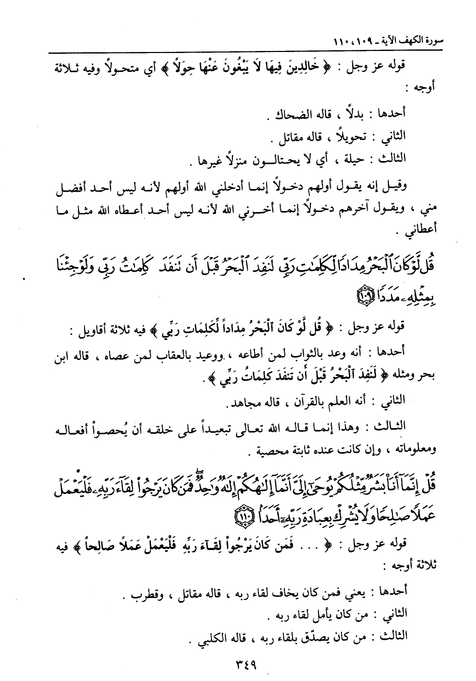{قل لو كان البحر مدادا لكلمات ربي لنفد البحر قبل أن تنفد كلمات ربي ولو جئنا بمثله مددا قل إنما أنا بشر مثلكم يوحى إلي أنما إلهكم إله واحد فمن كان يرجو لقاء ربه فليعمل عملا صالحا ولا يشرك بعبادة ربه أحدا} قوله عز وجل: {قُل لَّوْ كَانَ الْبَحْرُ مِدَاداً لِّكَلِمَاتِ رَبِّي} فيه ثلاثة أقاويل: أحدها: أنه وعد بالثواب لمن أطاعه , ووعيد بالعقاب لمن عصاه , قاله ابن بحر ومثله {لَنَفِدَ الْبَحْرُ قَبْلَ أَن تَنفَدَ كَلِمَاتُ رَبِّي} الثاني: أنه العلم بالقرآن , قاله مجاهد. الثالث: وهذا إنما قاله الله تعالى تبعيداً على خلقه أن يُحصواْ أفعاله ومعلوماته , وإن كانت عنده ثابتة محصية. {قل إنما أنا بشر مثلكم يوحى إلي أنما إلهكم إله واحد فمن كان يرجوا لقاء ربه فليعمل عملاً صالحاً ولا يشرك بعبادة ربه أحداً}. قوله عز وجل: {فمن كان يرجو لقاء ربه فليعمل عملاً صالحاً} فيه ثلاثة أوجه: أحدها: يعني فمن كان يخاف لقاء ربه، قاله مقاتل، وقطرب. الثاني: من كان يأمل لقاء ربه. الثالث: من كان يصدّق بلقاء ربه، قاله الكلبي.