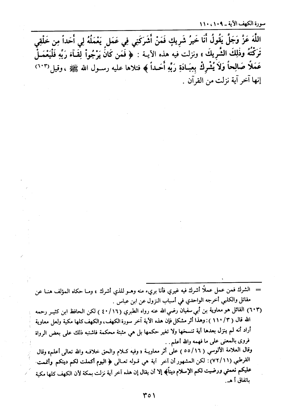 الله عزَّ وجلَّ يقول أنا خير شريك فمن أشركني في عمل يعمله لي أحداً من خلقي تركته وذلك الشريك " ونزلت فيه هذه الآية: {فمن كان يرجوا لقاء ربه فليعمل عملاً صالحاً ولا يشرك بعبادة ربه أحداً} فتلاها عليه رسول الله صلى الله عليه وسلم، وقيل إنها آخر آية نزلت من القرآن.