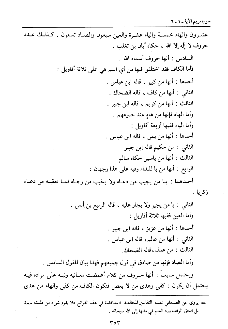 عشرون والهاء خمسة والياء عشرة والعين سبعون والصاد تسعون. كذلك عدد حروف لا إله إلا الله , حكه أبان بن تغلب. السادس: أنها حروف أسماء الله. فأما الكاف فقد اختلفوا فيها من أي اسم هي على ثلاثة أقاويل: أحدها: أنها من كبير , قاله ابن عباس. الثاني: أنها من كاف , قاله الضحاك. الثالث: أنها من كريم , قاله ابن جبير. وأما الهاء فإنها من هادٍ عند جميعهم. وأما الياء ففيها أربعة أقاويل: أحدها: أنها من يمن , قاله ابن عباس. الثاني: من حكيم قاله ابن جبير. الثالث: أنها من ياسين حكاه سالم. الرابع: أنها من يا للنداء وفيه على هذا وجهان: أحدهما: يا من يجيب من دعاه ولا يخيب من رجاه لما تعقبه من دعاء زكريا. الثاني: يا من يجير ولا يجار عليه , قاله الربيع بن أنس. وأما العين ففيها ثلاثة أقاويل: أحدها: أنها من عزيز , قاله ابن جبير. الثاني: أنها من عالم , قاله ابن عباس. الثالث: من عدل , قاله الضحاك. وأما الصاد فإنها من صادق في قول جميعهم فهذا بيان للقول السادس. ويحتمل سابعاً: أنها حروف من كلام أغمضت معانيه ونبه على مراده فيه يحتمل أن يكون: كفى وهدى من لا يعص فتكون الكاف من كفى والهاء من هدى