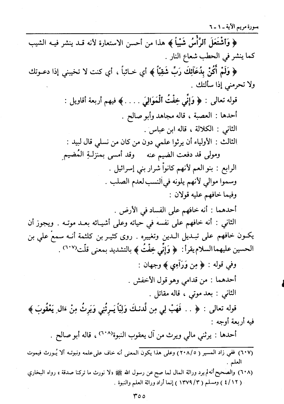 الرابع: بنو العلم لأنهم كانواْ شرار بني إسرائيل. وسموا موالي لأنهم يلونه في النسب لعدم الصلب. وفيما خافهم عليه قولان: أحدهما: أنه خافهم على الفساد في الأرض. الثاني: أنه خافهم على نفسه في حياته وعلى أشيائه بعد موته. ويجوز أن يكون خافهم على تبديل الدين وتغييره. روى كثير ابن كلثمة أنه سمع علي بن الحسين عليهما السلام يقرأ: {وَإِنِّي خِفْتُ} بالتشديد بمعنى قلّت. وفي قوله: {مِن وَرَآءِي} وجهان: أحدهما: من قدامي وهو قول الأخفش. الثاني: بعد موتي , قاله مقاتل. قوله تعالى: {. . فَهَبْ لِي مِن لَّدنكَ وَلِيّاً يَرِثُنِي وَيَرِثُ مِنْءَالِ يَعْقُوبَ} فيه أربعة أوجه: أحدها: يرثني مالي ويرث من آل يعقوب النبوة، قاله أبو صالح.