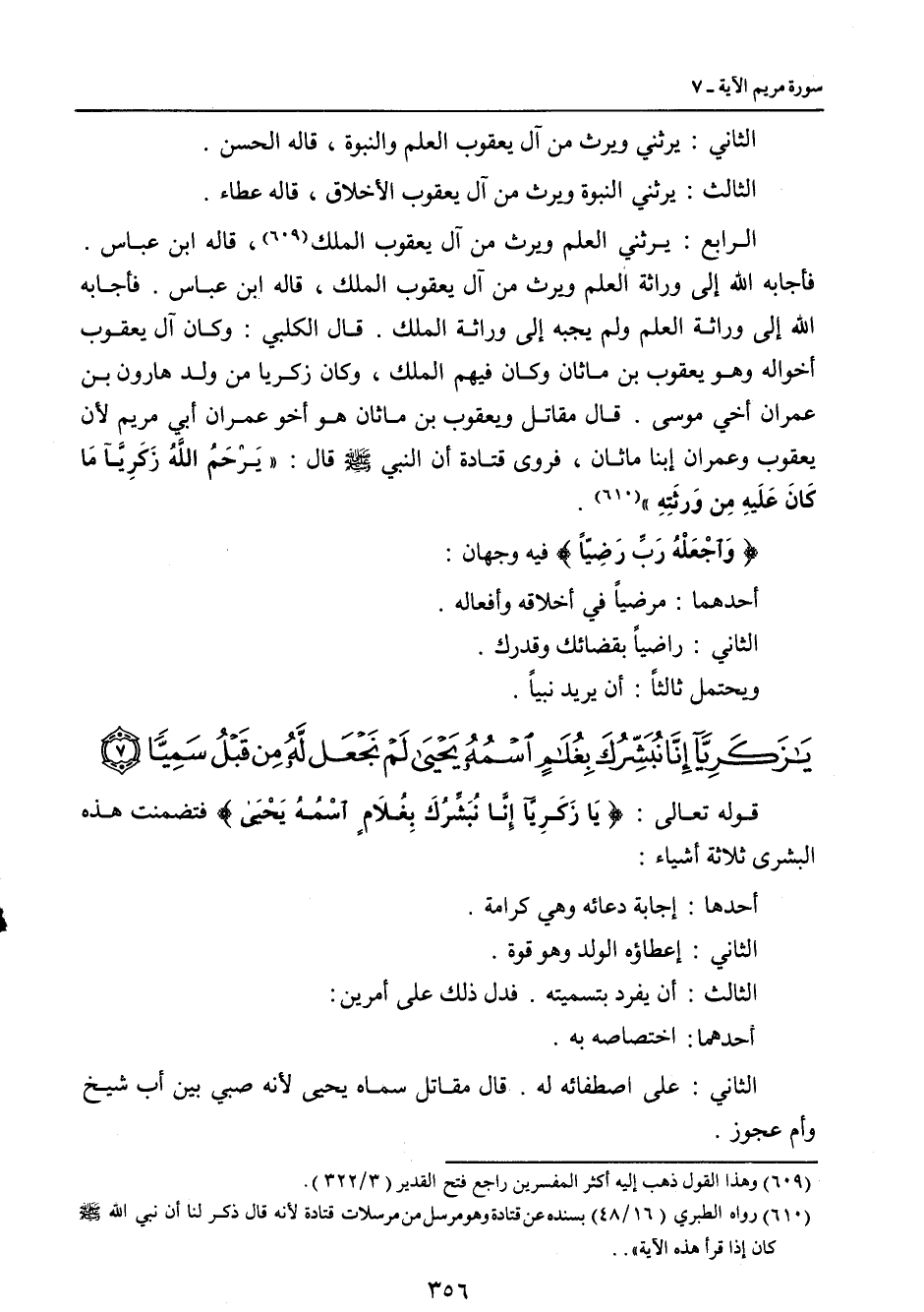 الثاني: يرثني ويرث من آل يعقوب العلم والنبوة , قاله الحسن. الثالث: يرثني النبوة ويرث من آل يعقوب الأخلاق , قاله عطاء. الرابع: يرثني العلم ويرث من آل يعقوب الملك , قاله ابن عباس , فأجابه الله إلى وراثة العلم ويرث من آل يعقوب الملك , قاله ابن عباس. فأجابه الله إلى وراثة العلم ولم يجبه إلى وارثة الملك. قال الكلبي: وكان آل يعقوب أخواله وهو يعقوب بن ماثان وكان فيهم الملك , وكان زكريا من ولد هارون بن عمران أخي موسى. قال مقاتل ويعقوب بن ماثان هو أخو عمران أبي مريم لأن يعقوب وعمران إِبنا ماثان , فروى قتادة أن النبي صلى الله عليه وسلم قال: (يَرْحَمُ اللَّهُ زَكَرِيَّآ مَا كَانَ عَلَيهِ مِن وَرثَتِهِ). {وَاجْعَلْهُ رَبِّ رَضِيّاً} فيه وجهان: أحدهما: مرضياً في أخلاقه وأفعاله. الثاني: راضياً بقضائك وقدرك. ويحتمل ثالثاً: أن يريد نبياً.