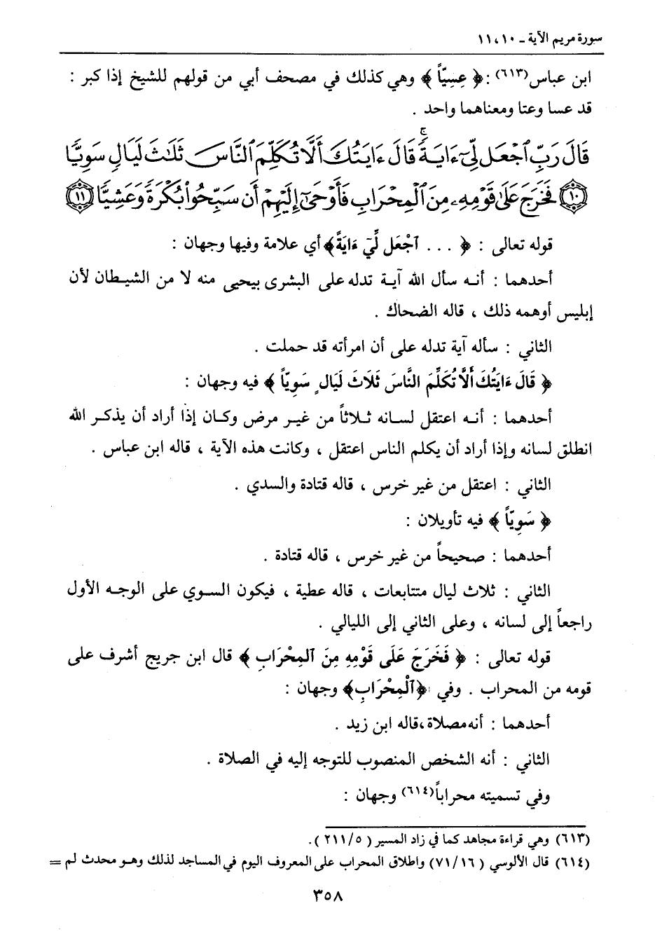 {قال رب اجعل لي آية قال آيتك ألا تكلم الناس ثلاث ليال سويا فخرج على قومه من المحراب فأوحى إليهم أن سبحوا بكرة وعشيا} قوله تعالى: { ... اجْعَل لِّيءَايَةً} أي علامة وفيها وجهان: أحدهما: أنه سأل الله آية تدله على البشرى بيحيى منه لا من الشيطان لأن إبليس أوهمه ذلك , قاله الضحاك. الثاني: سأله آية تدله على أن امرأته قد حملت. {قَالَءَايَتُكَ أَلاَّ تُكلِّمَ النَّاسَ ثَلاَثَ لَيَالٍ سَوِيّاً} فيه وجهان: أحدهما: أنه اعتقل لسانه ثلاثاً من غير مرض وكان إذا أراد أن يذكر الله انطلق لسانه وإذا أراد أن يكلم الناس اعتقل , وكانت هذه الآية , قاله ابن عباس الثاني: اعتقل من غير خرس , قاله قتادة والسدي. {سَوِيّاً} فيه تأويلان: أحدهما: صحيحاً من غير خرس , قاله قتادة. الثاني: ثلاث ليال متتابعات , قاله عطية , فيكون السوي على الوجه الأول راجعاً إلى لسانه , وعلى الثاني إلى الليالي. قوله تعالى: {فَخَرَجَ عَلَى قَوْمِهِ مِنَ المِحْرَابِ} قال ابن جريج أشرف على قومه من المحراب. وفي {الْمِحْرَابِ} وجهان: أحدهما: أنه مصلاة , قاله ابن زيد. الثاني: أنه الشخص المنصوب للتوجه إليه في الصلاة. وفي تسميته محراباً وجهان: