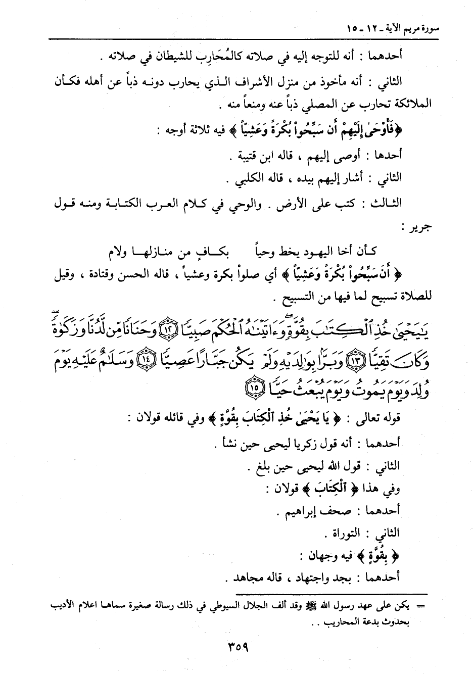 {يا يحيى خذ الكتاب بقوة وآتيناه الحكم صبيا وحنانا من لدنا وزكاة وكان تقيا وبرا بوالديه ولم يكن جبارا عصيا وسلام عليه يوم ولد ويوم يموت ويوم يبعث حيا} قوله تعالى: {يَا يَحْيَى خُذِ الْكِتَابَ بِقُوَّةٍ} وفي قائله قولان: أحدهما: أنه قول زكريا ليحيى حين نشأ. الثاني: قول الله ليحيى حين بلغ. وفي هذا {الْكِتَابَ} قولان: أحدهما: صحف إبراهيم. الثاني: التوراة. {بِقُوَّةٍ} فيه وجهان: أحدهما: بجد واجتهاد، قاله مجاهد.