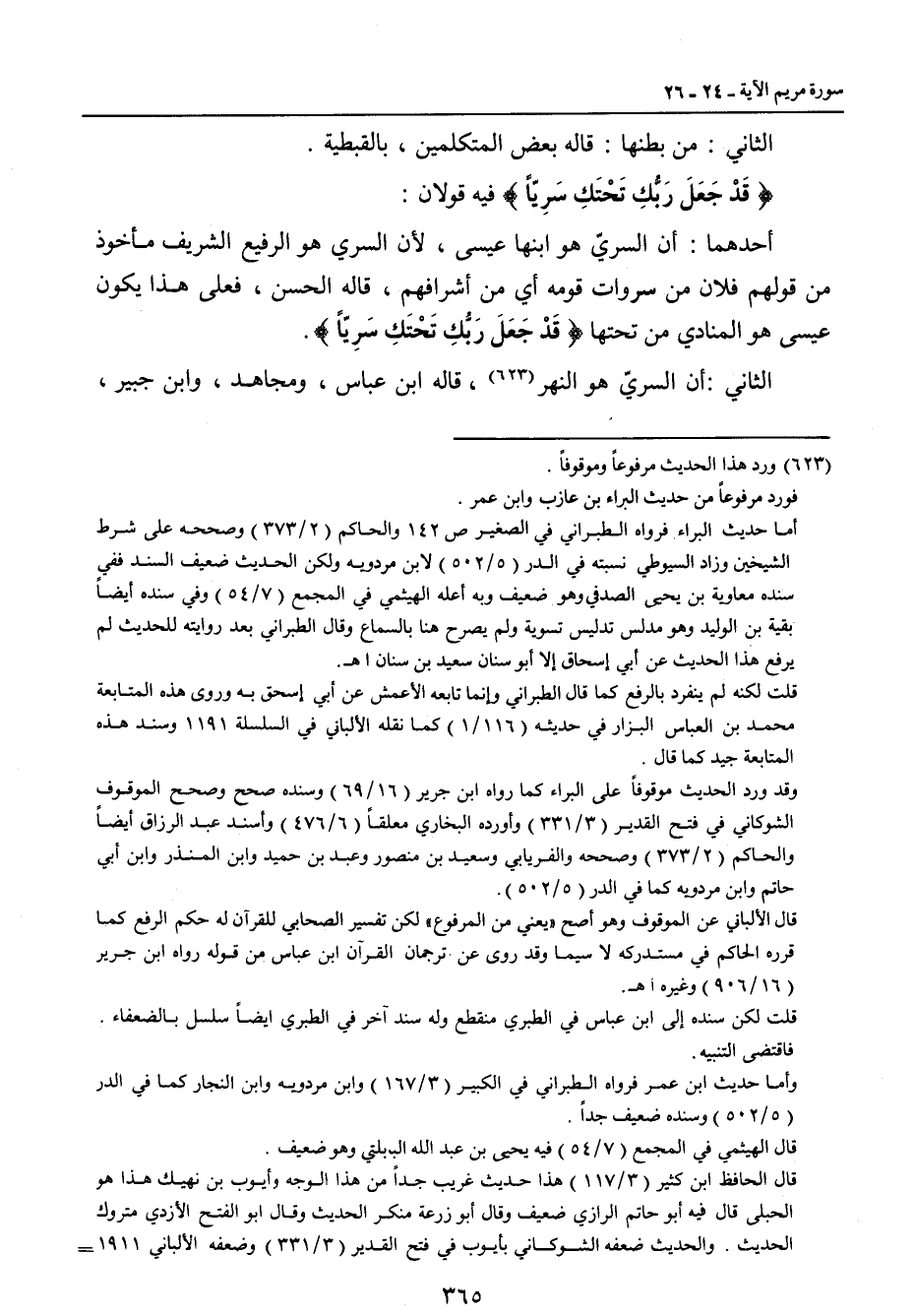 الثاني: من بطنها: قاله بعض المتكلمين , بالقبطية. {قَدْ جَعَلَ رَبُّكِ تَحْتَكِ سَرِيّاً} فيه قولان: أحدهما: أن السريّ هو ابنها عيسى , لأن السري هو الرفيع الشريف مأخوذ من قولهم فلان من سروات قومه أي من أشرافهم , قاله الحسن , فعلى هذا يكون عيسى هو المنادي من تحتها {قَدْ جَعَلَ رَبُّكِ تَحْتَكِ سَرِيّاً} الثاني: أن السريّ هو النهر، قاله ابن عباس، ومجاهد، وابن جبير،