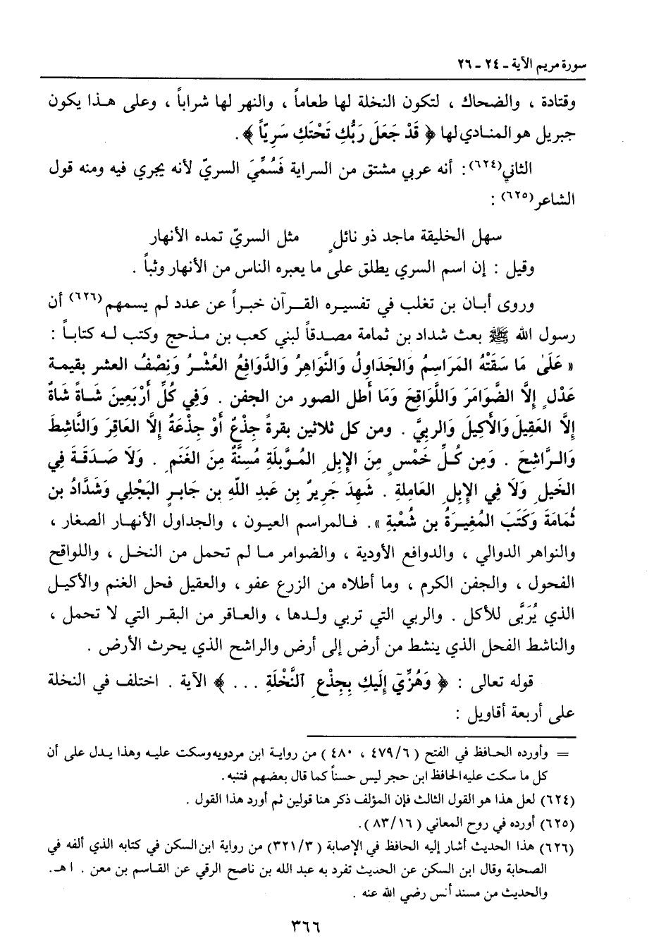 وقيل: إن اسم السري يطلق على ما يعبره الناس من الأنهار وثباً. وروى أبان بن تغلب في تفسيره القرآن خبراً عن عدد لم يسمهم أن رسول الله صلى الله عليه وسلم بعث شداد بن ثمامة مصدقاً لبني كعب بن مذحج وكتب له كتاباً: (عَلَى مَا سَقَتْهُ المَرَاسِمُ وَالجَدَاوِلُ وَالنَّوَاهِرُ وَالدَّوَافِعُ العُشْرُ وَنِصْفُ العشر بقيمة عَدْلٍ إِلاَّ الضَّوَامَرَ وَاللَّوَاقِحَ وَمَا َأطل الصور من الجفن. وَفِي كُلِّ أَرْبَعِينَ شَاةً شَاةٌ إِلاَّ العَقِيلَ وَالأَكِيلَ وَالربِيَّ. ومن كل ثلاثين بقرةً جِذْعٌ أَوْ جِذْعَةٌ إِلاَّ العَاقِرَ وَالنَّاشِطَ وَالرَّاشِحَ. وَمِن كُلِّ خَمْسٍ مِنَ الإِبِلِ المُوَّبلَةِ مُسِنَّةٌ مِنَ الغَنَمِ. وَلاَ صَدَقَةَ فِي الخَيلِ وَلاَ فِي الإِبِلِ العَامِلةِ. شَهِدَ جِرِيرٌ بِن عَبدِ اللَّهِ بن جَابرٍ البَجْلِي وَشَدَّادُ بن ثُمَامَةَ وَكَتَبَ المُغِيرَةُ بن شُعْبةِ) فالمراسل العيون , والجداول الأنهار الصغار , والنواهر الدوالي , والدوافع الأودية , والضوامر ما لم تحمل من النخل , واللواقح الفحول , والجفن الكرم , وما أطلاه من الزرع عفو , والعقيل فحل الغنم والأَيل الذي يُرَبَّى للأكل. والربي التي تربي ولدها والعاقر من البقر التي لا تحمل , والناشط الفحل الذي ينشط من أرض إلى أرض والراشح الذي يحرث الأرض. قوله تعالى: {وَهُزِّي إِلَيكِ بِجِذْعِ النَّخْلَةِ ... .} الآية. اختلف في النخلة. على أربعة أقاويل: