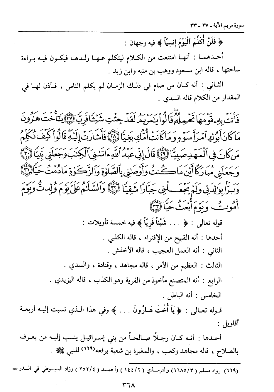 {فأتت به قومها تحمله قالوا يا مريم لقد جئت شيئا فريا يا أخت هارون ما كان أبوك امرأ سوء وما كانت أمك بغيا فأشارت إليه قالوا كيف نكلم من كان في المهد صبيا قال إني عبد الله آتاني الكتاب وجعلني نبيا وجعلني مباركا أين ما كنت وأوصاني بالصلاة والزكاة ما دمت حيا وبرا بوالدتي ولم يجعلني جبارا شقيا والسلام علي يوم ولدت ويوم أموت ويوم أبعث حيا} قوله تعالى: { ... شَيْئاً فَرِيّاً} فيه خمسة تأويلات: أحدها: أنه القبيح من الإفتراء , قاله الكلبي. الثاني: أنه العمل العجيب , قاله الأخفش. الثالث: العظيم من الأمر , قاله مجاهد , وقتادة , والسدي. الرابع: أنه المتصنع مأخوذ من الفرية وهو الكذب , قاله اليزيدي. الخامس: أنه الباطل. قوله تعالى: {يَآ أُخْتَ هَارُونَ ... } وفي هذا الذي نسبت إليه أربعة أقاويل: أحدها: أنه كان رجلاً صالحاً من بني إسرائيل ينسب إليه من يعرف بالصلاح , قاله مجاهد وكعب , والمغيرة بن شعبة يرفعه للنبي صلى الله عليه وسلم