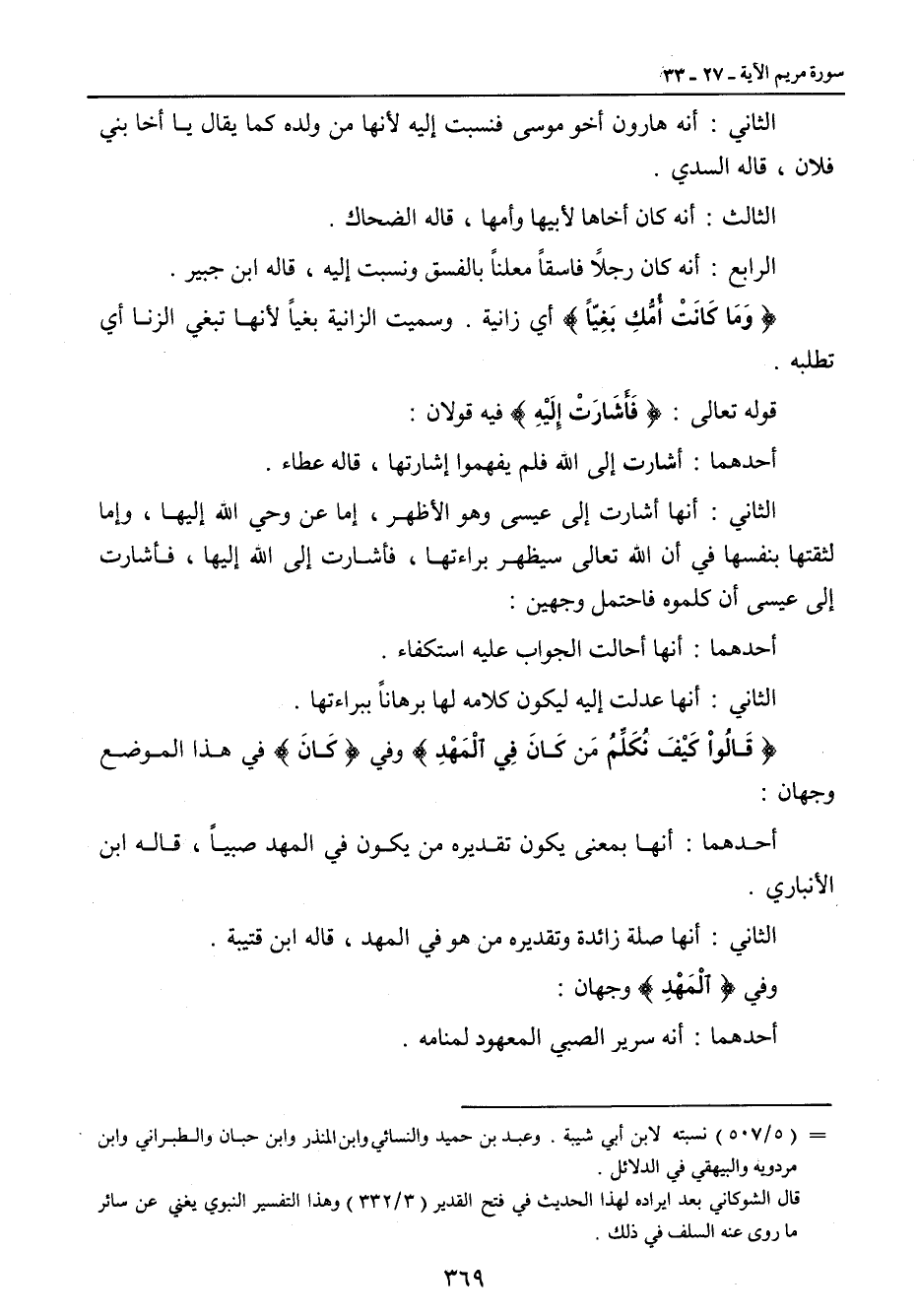 الثاني: أنه هارون أخو موسى فنسبت إليه لأنها من ولده كما يقال يا أخا بني فلان , قاله السدي. الثالث: أنه كان أخاها لأبيها وأمها , قاله الضحاك. الرابع: أنه كان رجلاً فاسقاً معلناً بالفسق ونسبت إليه , قاله ابن جبير. {وَمَا كَانَتْ أُمُّكِ بَغِيّاً} أي زانية. وسميت الزانية بغياً لأنها تبغي الزنا أي تطلبه. قوله تعالى: {فَأشَارَتْ إِلَيْهِ} فيه قولان: أحدهما: أشارت إلى الله فلم يفهموا إشارتها , قاله عطاء. الثاني: أنها أشارت إلى عيسى وهو الأظهر , إما عن وحي الله إليها , وإما لثقتها بنفسها في أن الله تعالى سيظهر براءتها , فأشارت إلى الله إليها , فأشارت إلى عيسى أن كلموه فاحتمل وجهين: أحدهما: أنها أحالت الجواب عليه استكفاء. الثاني: أنها عدلت إليه ليكون كلامه لها برهاناً ببراءتها. {قَالُواْ كَيْفَ نُكَلِّمُ مَن كَانَ فِي الْمَهْدِ} وفي {كَانَ} في هذا الموضع وجهان: أحدهما: أنها بمعنى يكون تقديره من يكون في المهد صبياً قاله ابن الأنباري. الثاني: أنها صلة زائدة وتقديره من هو في المهد , قاله ابن قتيبة. وفي {الْمَهْدِ} وجهان: أحدهما: أنه سرير الصبي المعهود لمنامه.