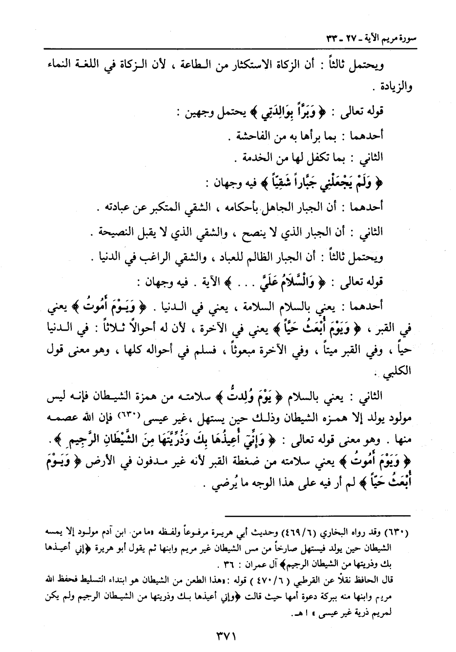 ويحتمل ثالثاً: أن الزكاة الاستكثار من الطاعة , لأن الزكاة في اللغة النماء والزيادة. قوله تعالى: {وَبَرَّاً بِوَالِدَتِي} يحتمل وجهين: أحدهما: بما برأها به من الفاحشة. الثاني: بما تكفل لها من الخدمة. {وَلَمْ يَجْعَلْنِي جَبَّاراً شَقِيّاً} فيه وجهان: أحدهما: أن الجبار الجاهل بأحكامه , الشقي المتكبر عن عبادته. الثاني: أن الجبار الذي لا ينصح , والشقي الذي لا يقبل النصيحة. ويحتمل ثالثاً: أن الجبار الظالم للعباد , والشقي الراغب في الدنيا. قوله تعالى: {وَالْسَّلاَمُ عَلَيَّ ... } الآية. فيه وجهان: أحدهما: يعني بالاسلام السلامة , يعني في الدنيا , {وَيَوْمَ أَمُوتُ} يعني في القبر , {وَيَوْمَ أُبْعَثُ حَيَّاً} يعني في الآخرة , لأن له أحوالاً ثلاثاً: في الدنيا حياً , وفي القبر ميتاً , وفي الآخرة مبعوثاً , فسلم في أحواله كلها , وهو معنى قول الكلبي. الثاني: يعني بالسلام {يَوْمَ وُلِدتُّ} سلامته من همزة الشيطان فإنه ليس مولود يولد إلا همزه الشيطان وذلك حين يستهل , غير عيسى فإن الله عصمه منها. وهو معنى قوله تعالى: {وَإِنِّي أُعِذُهَا وَذُرّيَّتَهَا مِنَ الشَّيْطَانِ الرَّجِيمِ} {وَيَوْْمَ أَمُوتُ} يعني سلامته من ضغطة القبر لأنه غير مدفون في الأرض {وَيَوْمَ أُبْعَثُ حَيّاً} لم أر فيه على هذا الوجه ما يُرضي.