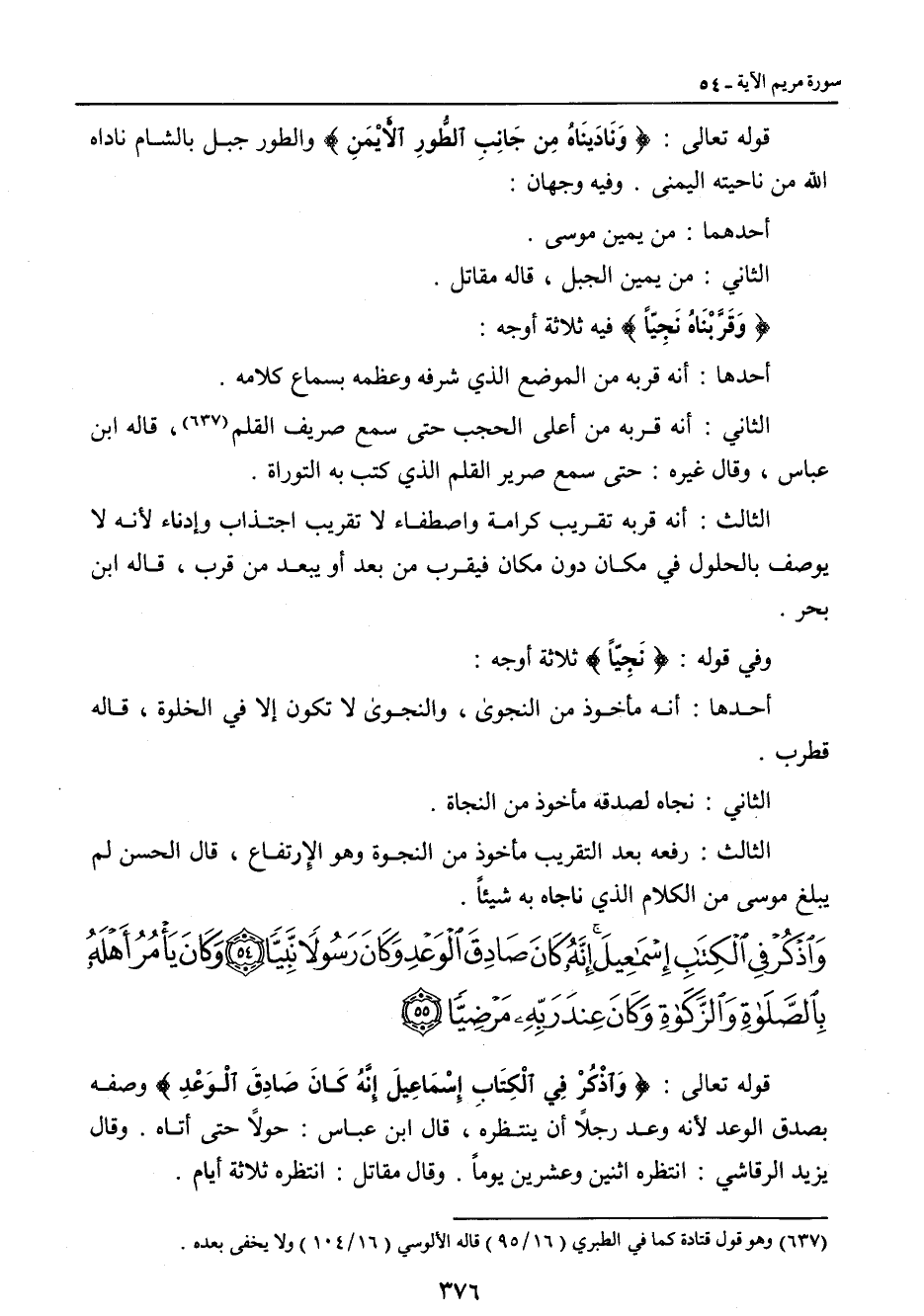 قوله تعالى: {وَنَادَينَاهُ مِن جَانِبِ الطُّورِ الأَيْمَنِ} والطور جبل بالشام ناداه الله من ناحيته اليمنى. وفيه وجهان: أحدهما: من يمين موسى. الثاني: من يمين الجبل , قاله مقاتل. {وَقَرَّبْنَاهُ نَجِيّاً} فيه ثلاثة أوجه: أحدها: أنه قربه من الموضع الذي شرفه وعظمه بسماع كلامه. الثاني: أنه قربه من أعلى الحجب حتى سمع صريف القلم , قاله ابن عباس , وقال غيره: حتى سمع صرير القلم الذي كتب به التوراة. الثالث: أنه قربه تقريب كرامة واصطفاء لا تقريب اجتذاب وإدناء لأنه لا يوصف بالحلول في مكان دون مكان فيقرب من بعد أو يبعد من قرب , قاله ابن بحر. وفي قوله: {نَجِيّاً} ثلاثة أوجه: أحدها: أنه مأخوذ من النجوى , والنجوى لا تكون إلا في الخلوة , قاله قطرب. الثاني: نجاه لصدقه مأخوذ من النجاة. الثالث: رفعه بعد التقريب مأخوذ من النجوة وهو الإِرتفاع , قال الحسن لم يبلغ موسى من الكلام الذي ناجاه به شيئاً.