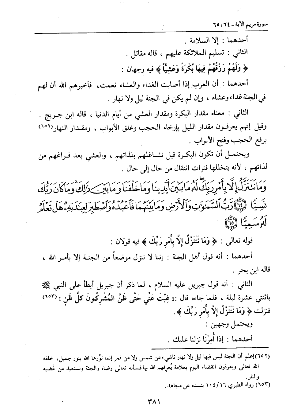 {وما نتنزل إلا بأمر ربك له ما بين أيدينا وما خلفنا وما بين ذلك وما كان ربك نسيا رب السماوات والأرض وما بينهما فاعبده واصطبر لعبادته هل تعلم له سميا} قوله تعالى: {وَمَا نَتَنَزَّلُ إِلاَّ بِأَمْرِ رَبِّكَ} فيه قولان: أحدهما: أنه قول أهل الجنة: إننا لا ننزل موضعاً من الجنة إلا بأمر الله , قاله ابن بحر. الثاني: أنه قول جبريل عليه السلام , لما ذكر أن جبريل أبطأ على النبي صلى الله عليه وسلم باثنتي عشرة ليلة , فلما جاءه قال: (غِبْتَ عَنِّي حَتَّى ظَنَّ المُشْرِكُونَ كلَّ ظَنٍ). فنزلت {وَمَا نَتَنَزَّلُ إِلاَّ بِأَمْرِ ربِّكَ} ويحتمل وجهين: أحدهما: إذا أُمِرْنَا نزلنا عليك.