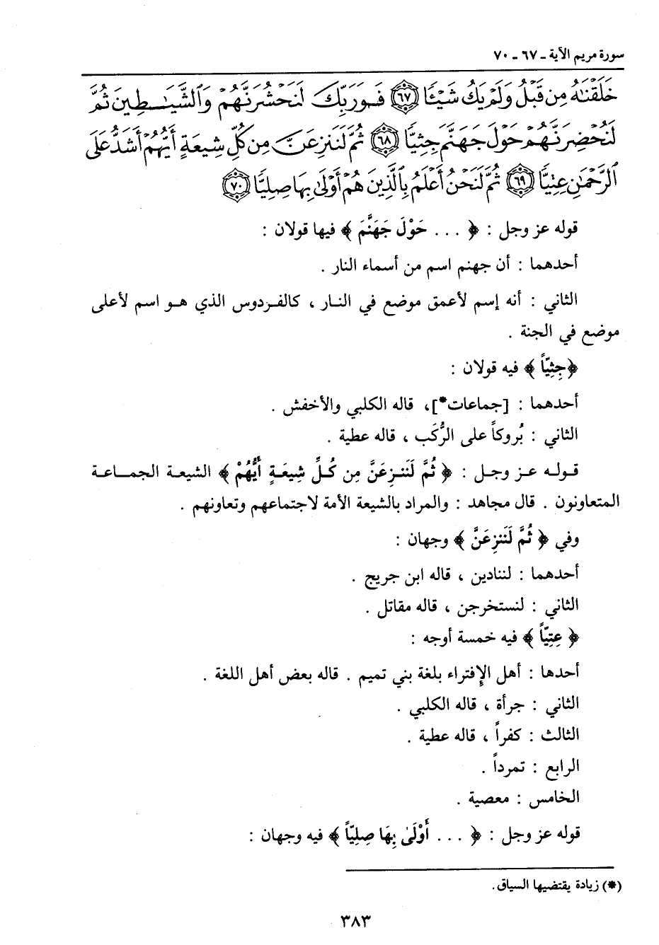 خلقناه من قبل ولم يك شيئا فوربك لنحشرنهم والشياطين ثم لنحضرنهم حول جهنم جثيا ثم لننزعن من كل شيعة أيهم أشد على الرحمن عتيا ثم لنحن أعلم بالذين هم أولى بها صليا} قوله عز وجل: { ... حَوْلَ جَهَنَّمَ} فيها قولان: أحدهما: أن جهنم اسم من أسماء النار. الثاني: أنه إسم لأعمق موضع في النار , كالفردوس الذي هو اسم لأعلى موضع في الجنة. {جِثِيّاً} فيه قولان: أحدهما: [جماعات] , قاله الكلبي والأخفش. الثاني: بُروكاً على الرُّكَب , قاله عطية. قوله عز وجل: {ثُمَّ لَنَنزِعَنَّ مِن كُلِّ شِيعَةٍ أَيُّهُمْ} الشيعة الجماعة المتعاونون. قال مجاهد: والمراد بالشيعة الأمة لاجتماعهم وتعاونهم. وفي {ثُمَّ لَنَنزِعَنَّ} وجهان: أحدهما: لننادين , قاله ابن جريج. الثاني: لنستخرجن , قاله مقاتل. {عِتِيّاً} فيه خمسة أوجه: أحدها: أهل الإِفتراء بلغة بني تميم , قاله بعض أهل اللغة. الثاني: جرأة , قاله الكلبي. الثالث: كفراً , قاله عطية. الرابع: تمرداً. الخامس: معصية. قوله عز وجل: { ... أَوْلَى بِهَا صليّاً} فيه وجهان: