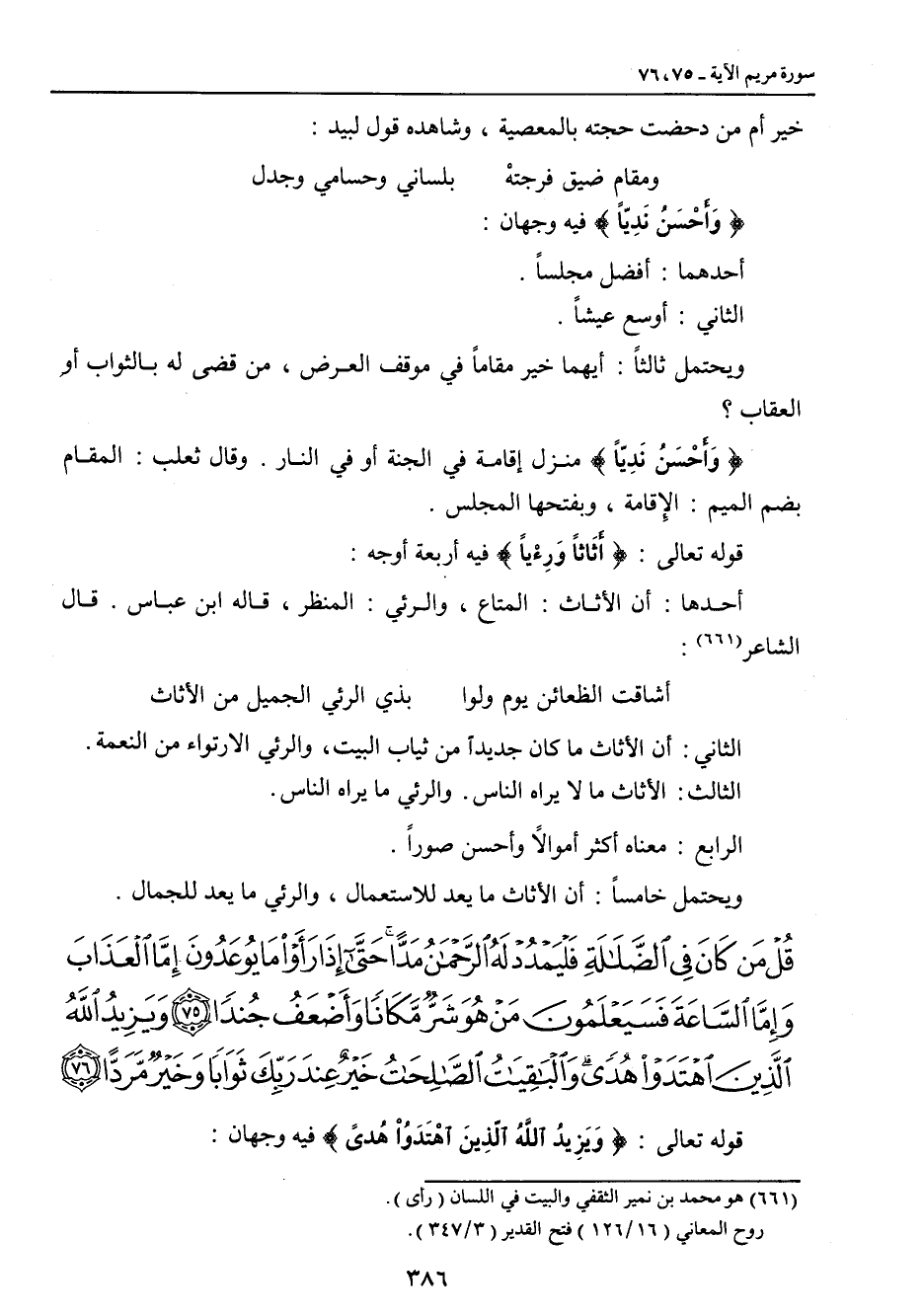 {وَأحْسَنُ نَدِيّاً} فيه وجهان: أحدهما: أفضل مجلساً. الثاني: أوسع عيشاً. ويحتمل ثالثاً: أيهما خير مقاماً في موقف العرض , من قضى له بالثواب أو العقاب؟ {وَأَحْسَنُ نَدِيّاً} منزل إقامة في الجنة أو في النار , وقال ثعلب: المقام بضم الميم: الإِقامة , وبفتحها المجلس. قوله تعالى: {أَثَاثاً وَرِءْيَاً} فيه أربعة أوجه: أحدها: أن الأثاث: المتاع , والرئي: المنظر , قاله ابن عباس. قال الشاعر: