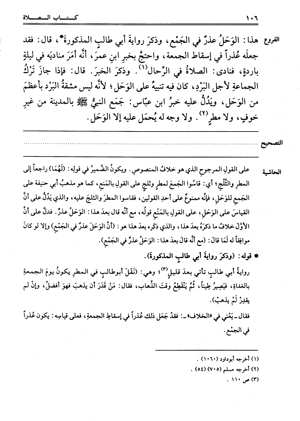هَذَا: الْوَحْلُ عُذْرٌ فِي الْجَمْعِ، وَذَكَرَ رِوَايَةَ أَبِي طَالِبٍ الْمَذْكُورَةَ، قَالَ: فَقَدْ جَعَلَهُ عُذْرًا فِي إسْقَاطِ الْجُمُعَةِ، وَاحْتَجَّ بِخَبَرِ ابْنِ عُمَرَ أَنَّهُ أَمَرَ مُنَادِيَهُ فِي لَيْلَةٍ بَارِدَةٍ فَنَادَى: الصَّلَاةُ فِي الرِّحَالِ1. وَذَكَرَ الْخَبَرَ، قَالَ: فَإِذَا جَازَ تَرْكُ الْجَمَاعَةِ لَأَجْلِ الْبَرْدِ، كَانَ فِيهِ تَنْبِيهًا عَلَى الْوَحْلِ "لِأَنَّهُ" لَيْسَ مَشَقَّةُ الْبَرْدِ بِأَعْظَمَ مِنْ الْوَحْلِ، وَيَدُلُّ عَلَيْهِ خَبَرُ ابْنِ عَبَّاسٍ جَمَعَ النَّبِيُّ صَلَّى اللَّهُ عَلَيْهِ وَسَلَّمَ فِي الْمَدِينَةِ مِنْ غَيْرِ خَوْفٍ وَلَا مَطَرٍ2. وَلَا وَجْهَ لَهُ يُحْمَلُ عَلَيْهِ إلَّا الوحل.
