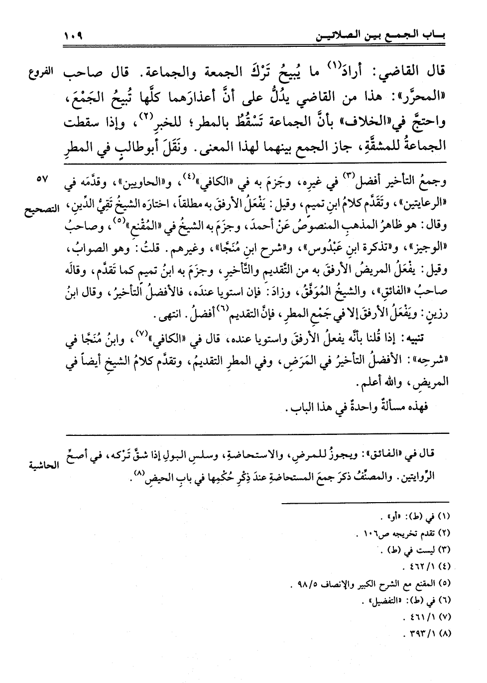 ـــــــــــــــــــــــــــــQوجمع التأخير أفضل3 فِي غَيْرِهِ وَجَزَمَ بِهِ فِي "الْكَافِي"4، وَالْحَاوِيَيْنِ، وَقَدَّمَهُ فِي الرِّعَايَتَيْنِ، وَتَقَدَّمَ كَلَامُ ابْنِ تَمِيمٍ. وَقِيلَ: يَفْعَلُ الْأَرْفَقَ بِهِ مُطْلَقًا، اخْتَارَهُ الشَّيْخُ تَقِيُّ الدِّينِ، وَقَالَ: هُوَ ظَاهِرُ الْمَذْهَبِ الْمَنْصُوصُ عَنْ أَحْمَدَ، وَجَزَمَ بِهِ الشَّيْخُ فِي "الْمُقْنِعِ"5، وَصَاحِبُ الْوَجِيزِ، وَتَذْكِرَةِ ابْنِ عَبْدُوسٍ، وَشَرْحِ ابْنِ مُنَجَّى، وَغَيْرِهِمْ "قُلْت": وَهُوَ الصَّوَابُ، وَقِيلَ: يَفْعَلُ المريض الْأَرْفَقَ بِهِ مِنْ التَّقْدِيمِ وَالتَّأْخِيرِ، وَجَزَمَ بِهِ ابْنُ تَمِيمٍ كَمَا تَقَدَّمَ، وَقَالَهُ صَاحِبُ الْفَائِقِ، وَالشَّيْخُ الْمُوَفَّقُ، وَزَادَ: فَإِنْ اسْتَوَيَا عِنْدَهُ فَالْأَفْضَلُ التَّأْخِيرُ، وَقَالَ ابْنُ رَزِينٍ: وَيَفْعَلُ الْأَرْفَقَ إلَّا فِي جَمْعِ الْمَطَرِ فَإِنَّ التَّقْدِيمَ6 أَفْضَلُ. انْتَهَى.