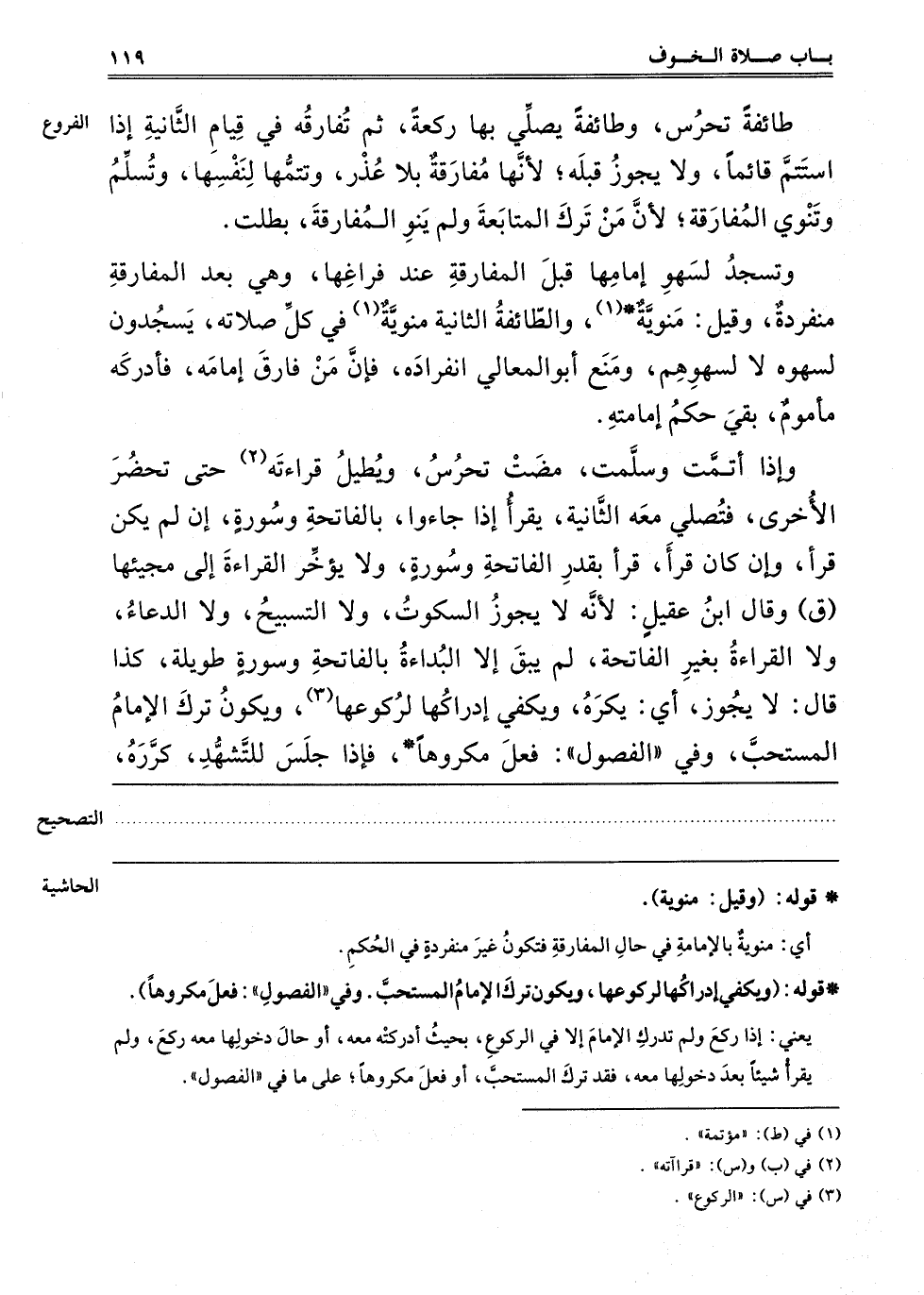 طَائِفَةٌ تَحْرُسُ وَطَائِفَةٌ يُصَلِّيَ بِهَا رَكْعَةً ثُمَّ تُفَارِقُهُ فِي قِيَامِ الثَّانِيَةِ إذَا اسْتَتَمَّ قَائِمًا، وَلَا يَجُوزُ قَبْلَهُ؛ لِأَنَّهَا مُفَارِقَةٌ بِلَا عُذْرٍ، وَتُتِمُّهَا لِنَفْسِهَا، وَتُسَلِّمُ وَتَنْوِي الْمُفَارِقَةَ؛ لِأَنَّ مَنْ تَرَكَ الْمُتَابَعَةَ وَلَمْ يَنْوِ الْمُفَارَقَةَ بَطَلَتْ.