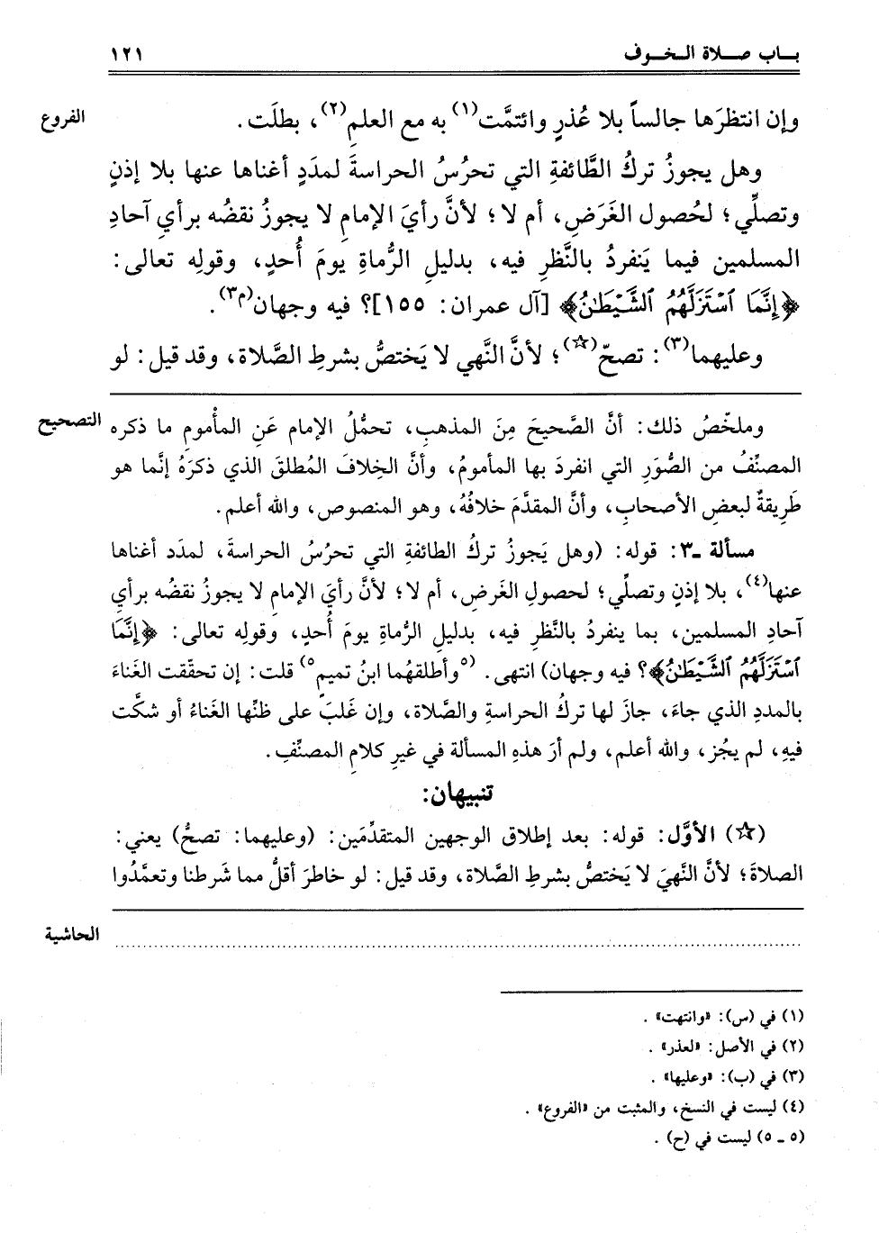 وَهَلْ يَجُوزُ تَرْكُ الطَّائِفَةِ الَّتِي تَحْرُسُ الْحِرَاسَةَ لِمَدَدٍ أَغْنَاهَا عَنْهَا بِلَا إذْنٍ وَتُصَلِّي، لِحُصُولِ الْغَرَضِ، أَمْ "لَا" لِأَنَّ رَأْيَ الْإِمَامِ لَا يَجُوزُ نَقْضُهُ بِرَأْيِ آحَادِ الْمُسْلِمِينَ فِيمَا يَنْفَرِدُ بِالنَّظَرِ فِيهِ، بِدَلِيلِ الرُّمَاةِ يَوْمَ أُحُدٍ وقَوْله تَعَالَى: {إِنَّمَا اسْتَزَلَّهُمُ الشَّيْطَانُ} [آل عمران: 155] ؟ فيه وجهان "م 3".