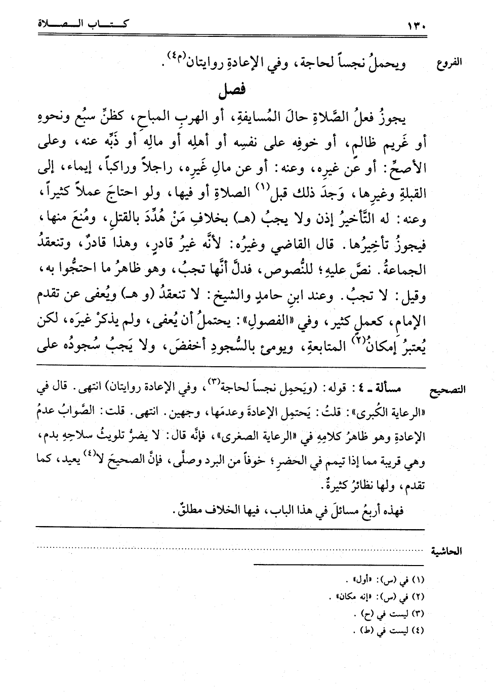 ـــــــــــــــــــــــــــــQمَسْأَلَةٌ - 4: قَوْلُهُ: وَيَحْمِلُ نَجَسًا لِحَاجَةٍ3، وَفِي الْإِعَادَةِ رِوَايَتَانِ، انْتَهَى قَالَ فِي الرِّعَايَةِ الْكُبْرَى: قُلْت: يَحْتَمِلُ الْإِعَادَةَ وَعَدَمَهَا وَجْهَيْنِ، انْتَهَى، قُلْت: الصَّوَابُ عَدَمُ الْإِعَادَةِ وَهُوَ ظَاهِرُ كَلَامِهِ فِي الرِّعَايَةِ الصُّغْرَى، فَإِنَّهُ قَالَ: لَا يَضُرُّ تَلْوِيثُ سِلَاحِهِ بِدَمٍ، وَهِيَ قَرِيبَةٌ مِمَّا إذَا تَيَمَّمَ فِي الْحَضَرِ خَوْفًا مِنْ الْبَرْدِ وَصَلَّى، فَإِنَّ الصَّحِيحَ لا4 يُعِيدُ كَمَا تَقَدَّمَ، وَلَهَا نَظَائِرُ كَثِيرَةٌ.