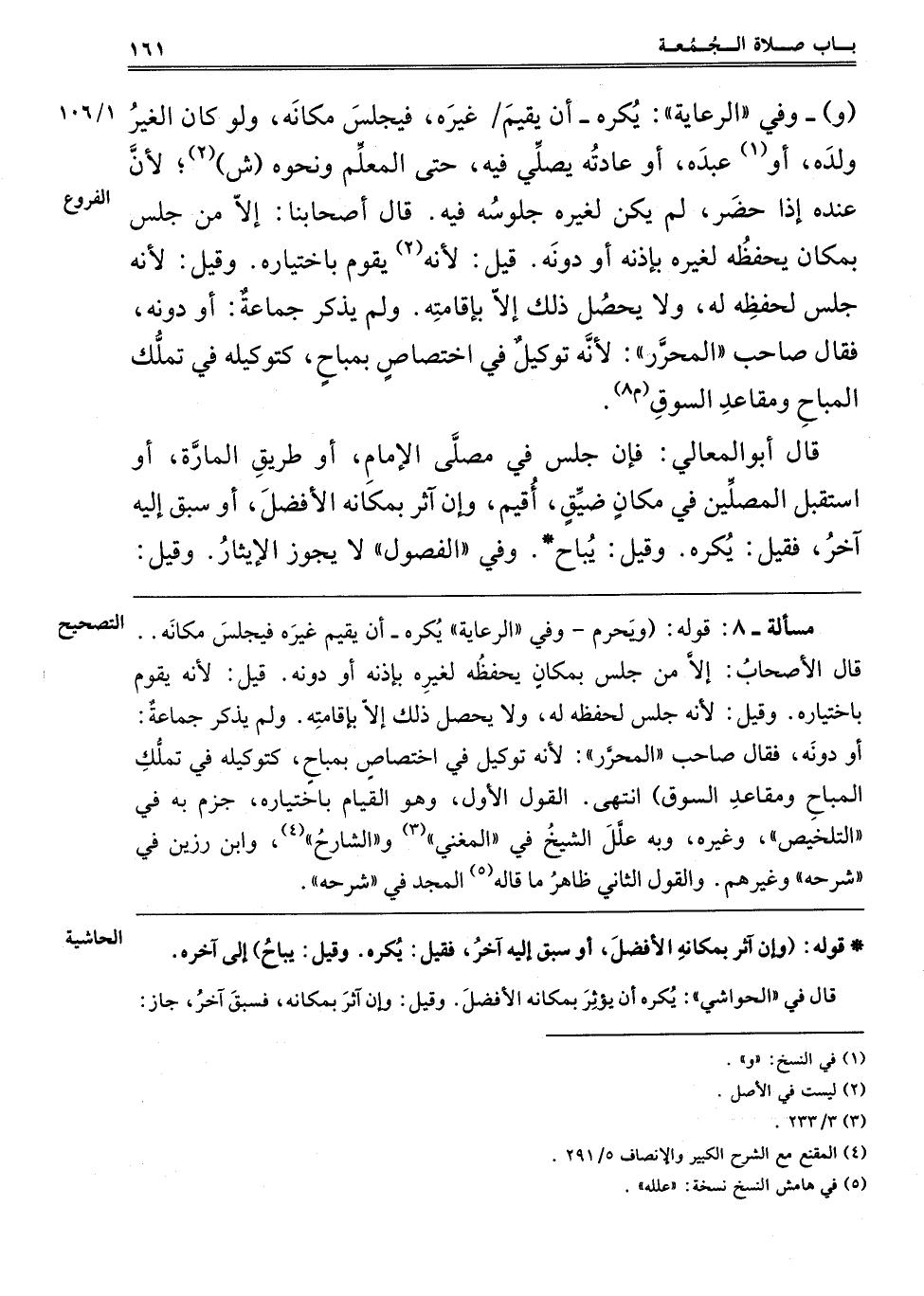 ـــــــــــــــــــــــــــــQمَسْأَلَةٌ - 8: قَوْلُهُ: وَيَحْرُمُ وَفِي الرِّعَايَةِ يُكْرَهُ أَنْ يُقِيمَ غَيْرَهُ فَيَجْلِسَ مَكَانَهُ قَالَ الْأَصْحَابُ: إلَّا مَنْ جَلَسَ بِمَكَانٍ يَحْفَظُهُ لِغَيْرِهِ بِإِذْنِهِ أَوْ دونه، قيل: لأنه يقوم باختياره، وقيل: لأنه جَلَسَ لِحِفْظِهِ لَهُ، وَلَا يَحْصُلُ ذَلِكَ إلَّا بِإِقَامَتِهِ، وَلَمْ يَذْكُرْ جَمَاعَةً: أَوْ دُونَهُ، فَقَالَ صَاحِبُ الْمُحَرَّرِ: لِأَنَّهُ تَوْكِيلٌ فِي اخْتِصَاصٍ بِمُبَاحٍ كَتَوْكِيلِهِ فِي تَمَلُّكِ الْمُبَاحِ وَمَقَاعِدِ السُّوقِ، انْتَهَى الْقَوْلُ الْأَوَّلُ وَهُوَ الْقِيَامُ بِاخْتِيَارِهِ، جَزَمَ بِهِ فِي التَّلْخِيصِ وَغَيْرِهِ، وَبِهِ عَلَّلَ الشَّيْخُ فِي المغني3 والشارح4، وابن رَزِينٍ فِي شَرْحِهِ، وَغَيْرُهُمْ. وَالْقَوْلُ الثَّانِي ظَاهِرُ ما قاله5 المجد في شرحه.